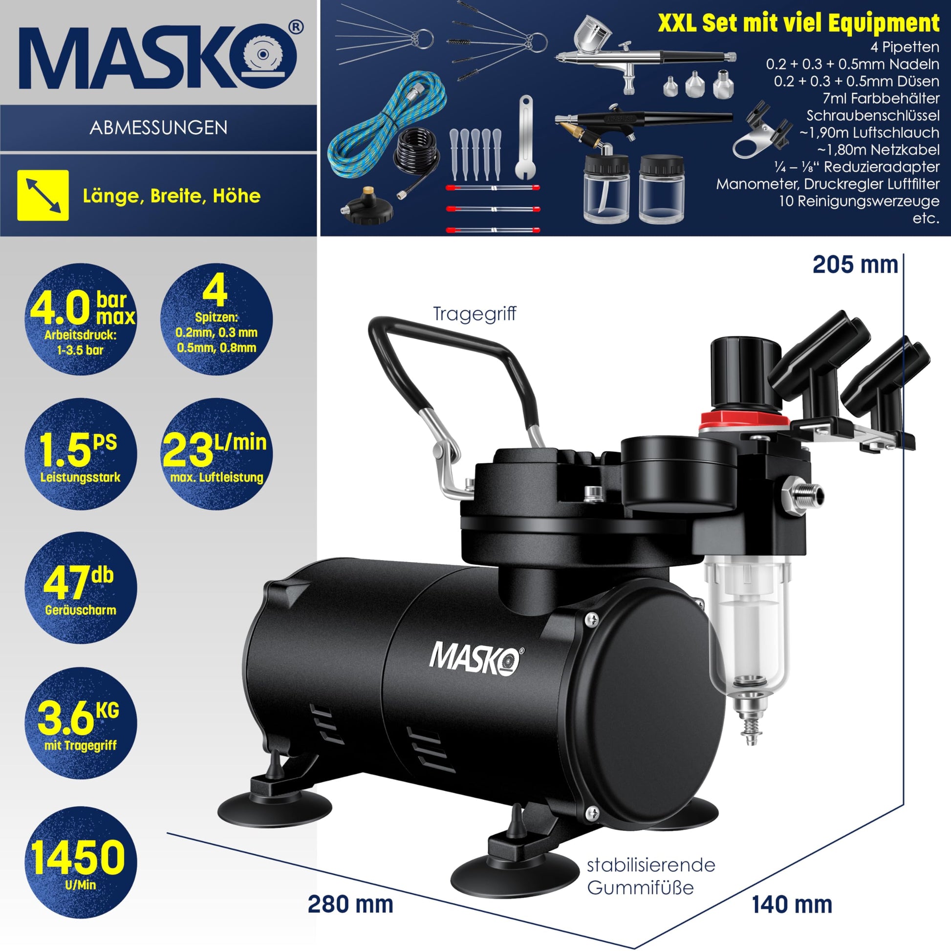 MASKO Airbrush-Set Kompressor 4 bar – Dual Multifunktions Set