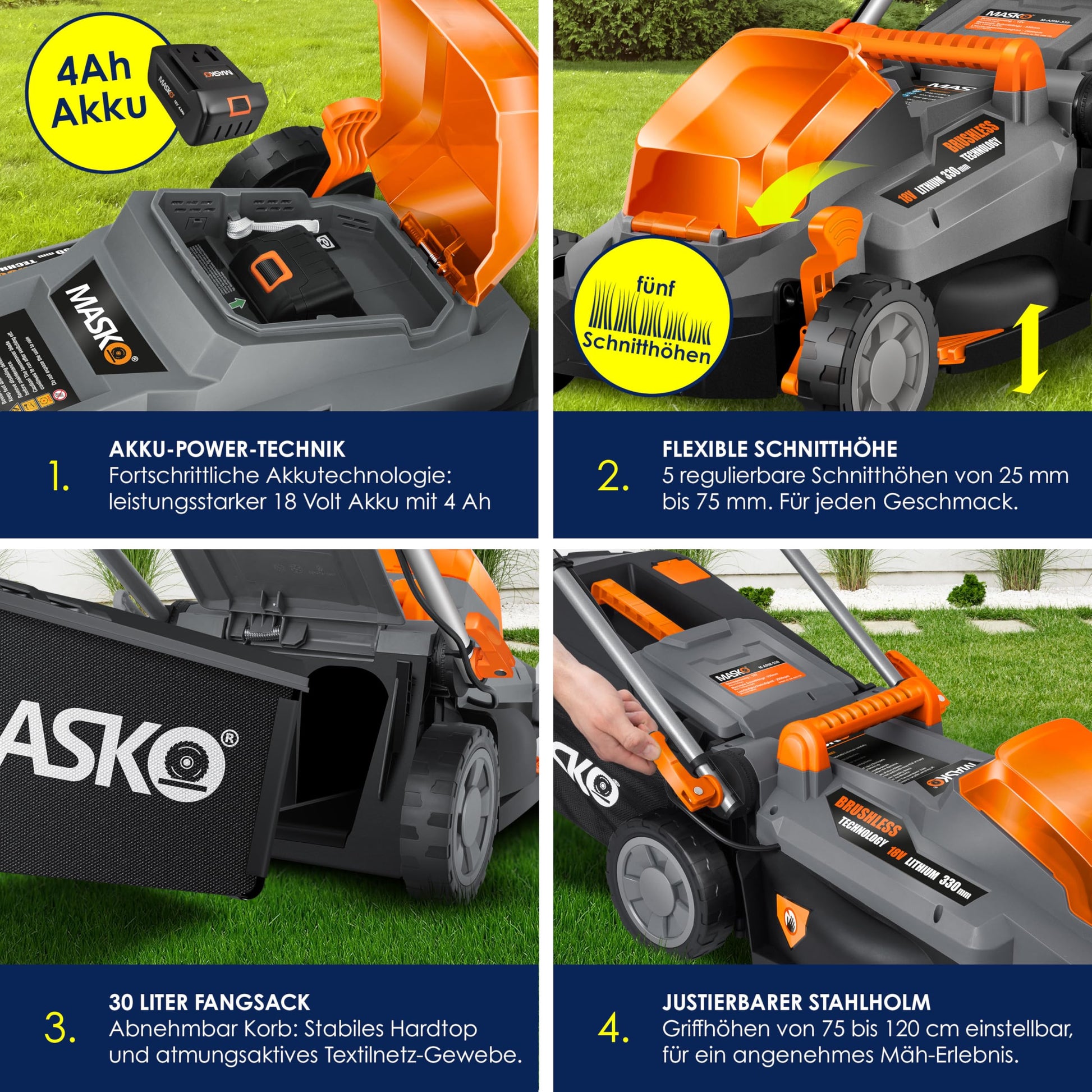 MASKO Akku Rasenmäher Mulch 33cm – inkl. 4Ah Akku Set