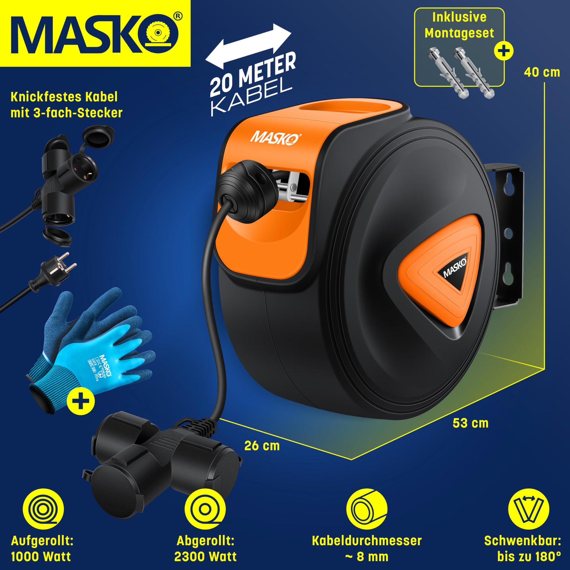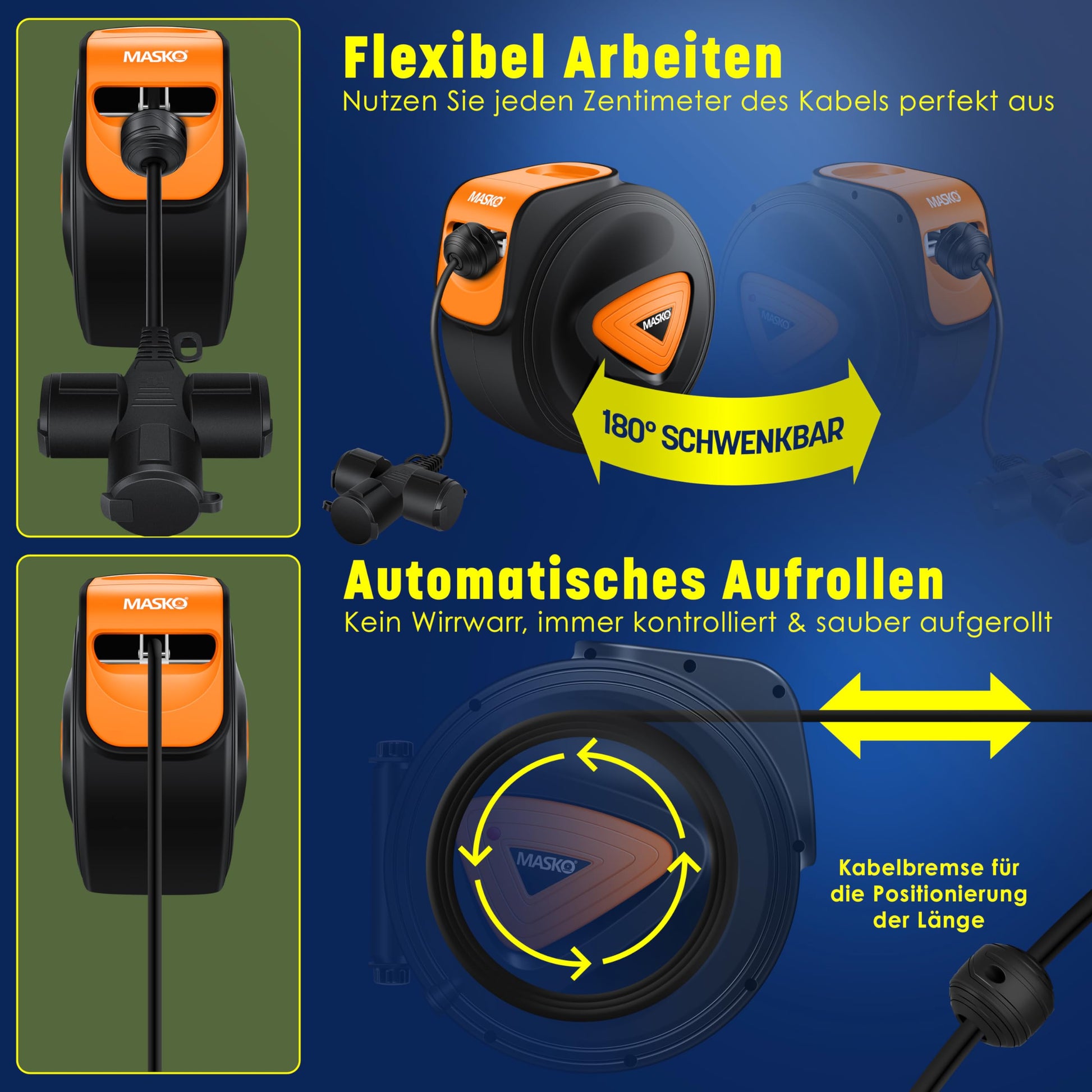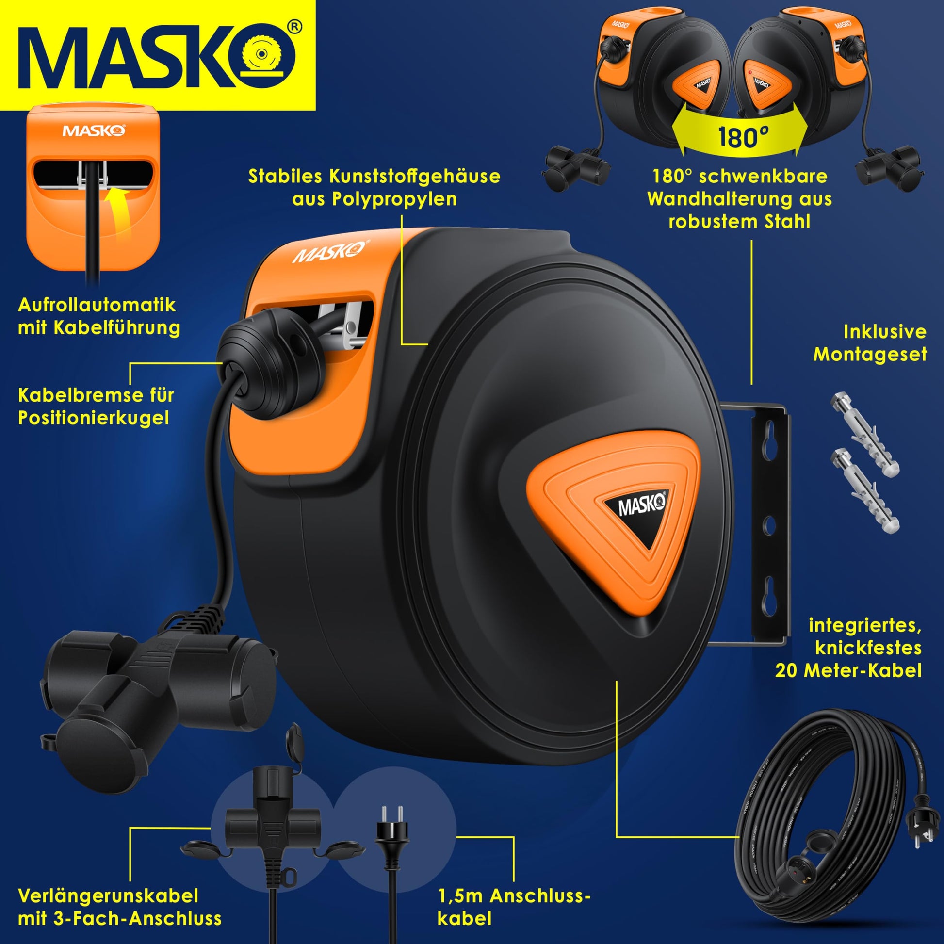 MASKO Automatik Kabeltrommel Verlängerungskabel 20m – 3-fach Wand