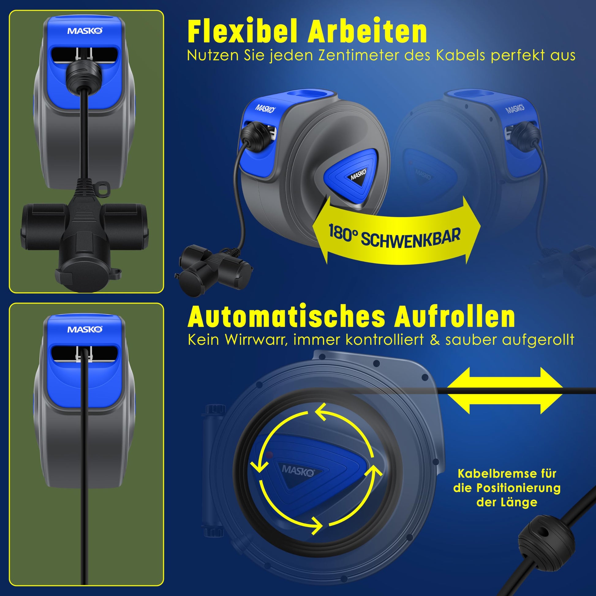 Die MASKO Automatik-Kabeltrommel ist die ideale Lösung für eine aufgeräumte und sichere Stromversorgung in Ihrer Werkstatt, Garage oder im Hobbyraum. Sie kombiniert hohe Leistungsfähigkeit mit durchdachten Sicherheitsmerkmalen und maximaler Flexibilität.