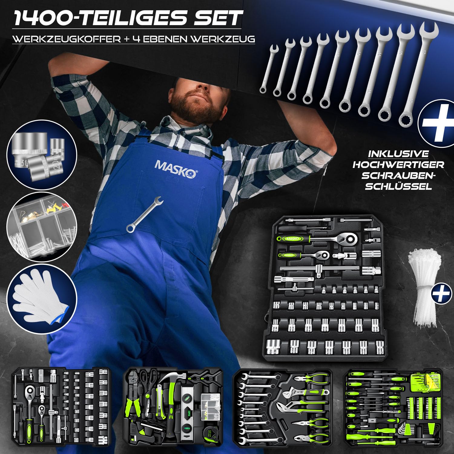 MASKO® Werkzeugkoffer Werkzeugset Gefüllt - 1400-teilig mit Rollen