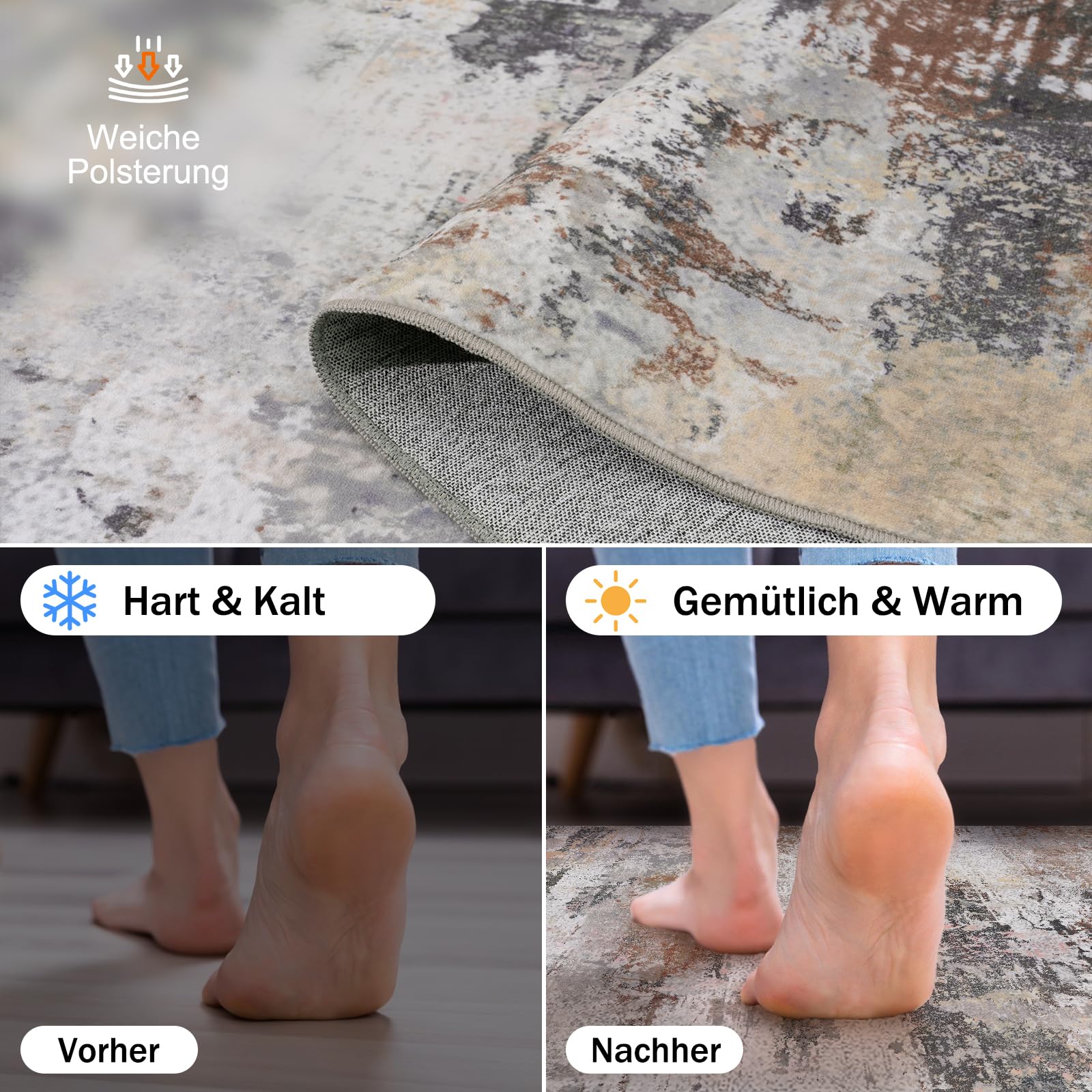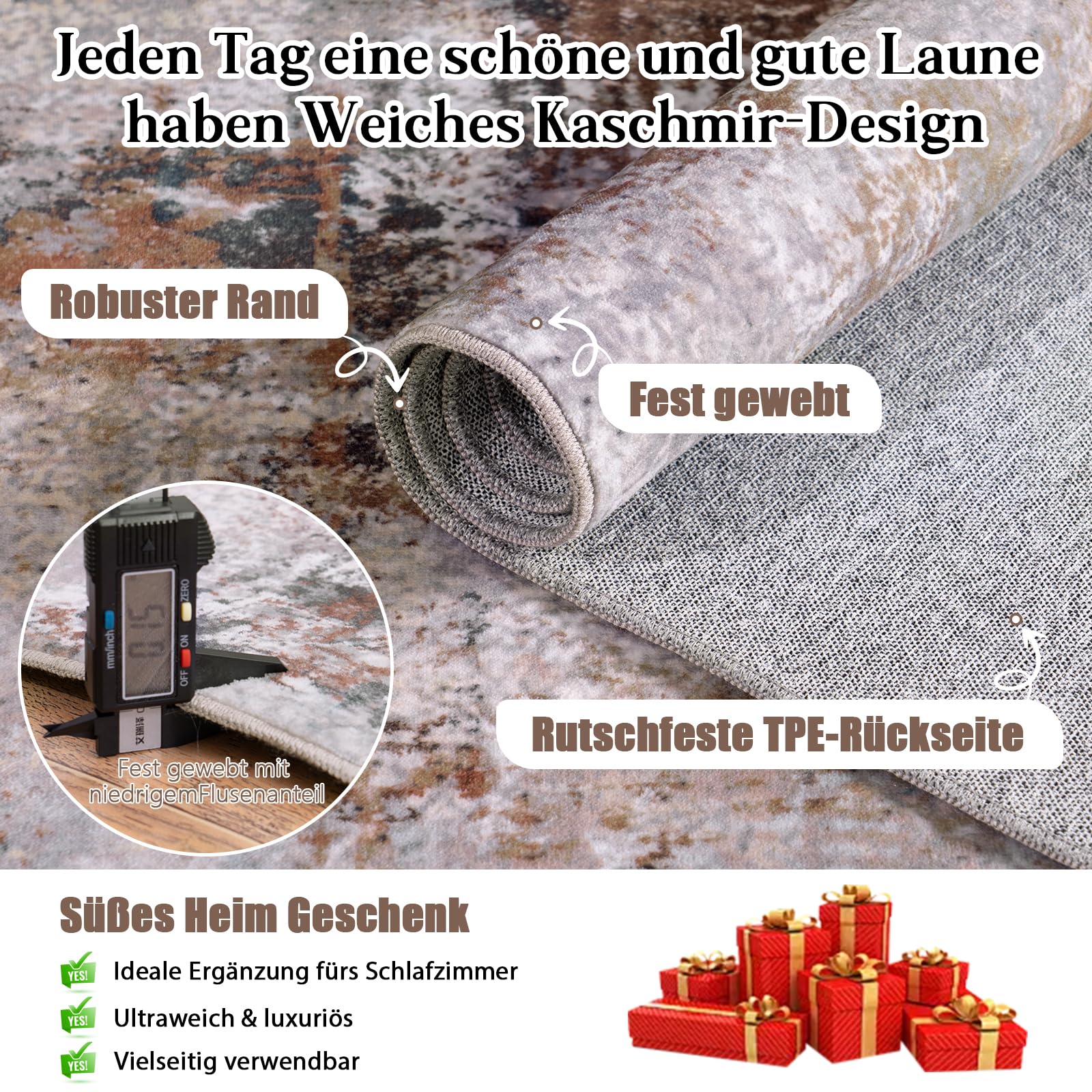 Die weiche Oberfläche aus Imitationswolle bietet ein angenehmes Gefühl unter den Füssen und ist gleichzeitig äusserst robust. Dank der rutschfesten Gummi-Unterseite bleibt der Teppich sicher an seinem Platz, was ihn zu einer idealen Wahl für Haushalte mit Kindern und Haustieren macht. Er schützt zudem Ihre Böden zuverlässig vor Kratzern und Abnutzung.
