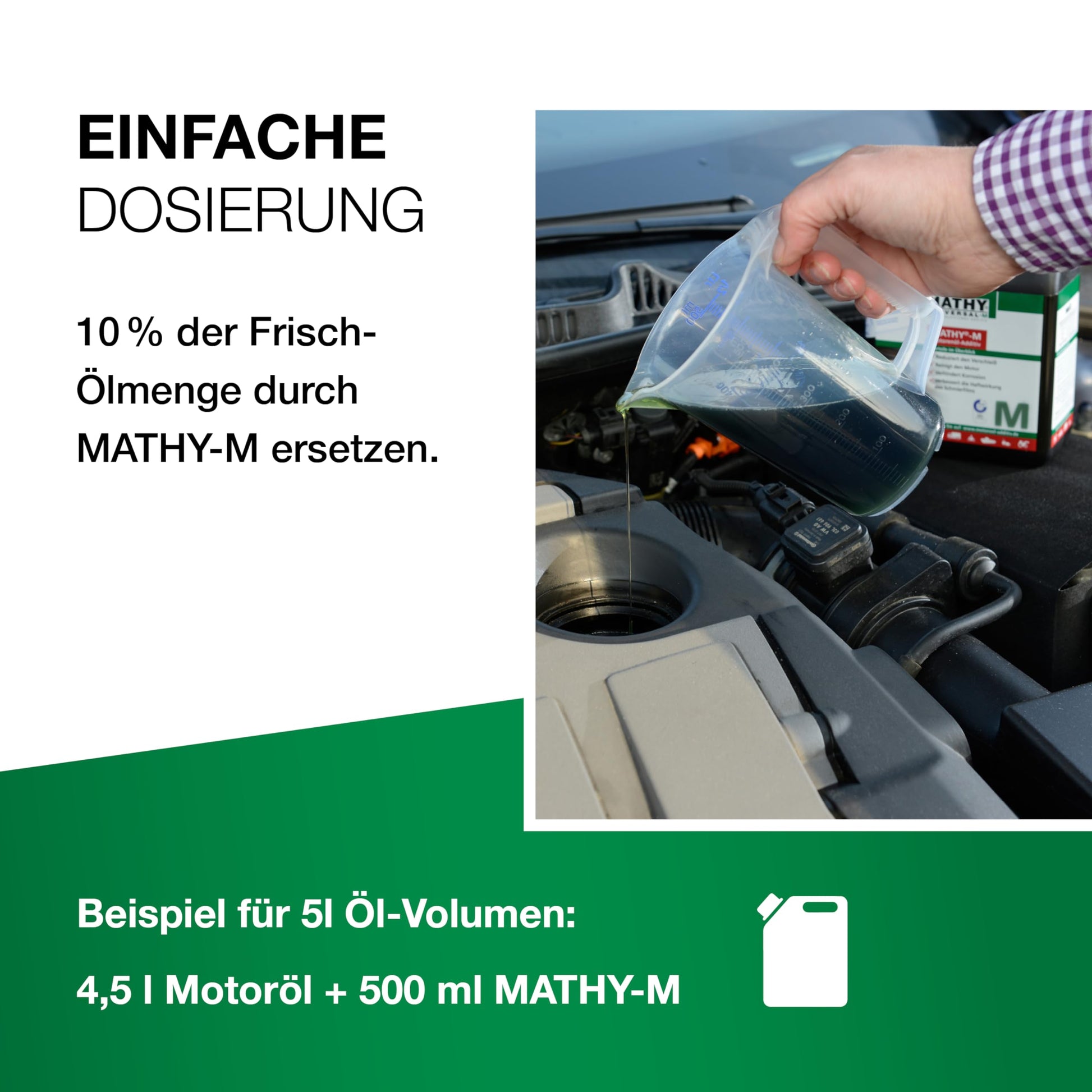 MATHY-M sollte bei jedem Ölwechsel im Verhältnis von 10 % zur Gesamtölmenge hinzugefügt werden. Bei einer Füllmenge von 5 Litern verwenden Sie also 0,5 Liter MATHY-M und 4,5 Liter frisches Motoröl. Bei Laufleistungen über 30'000 km wird eine vorherige Motorreinigung empfohlen.