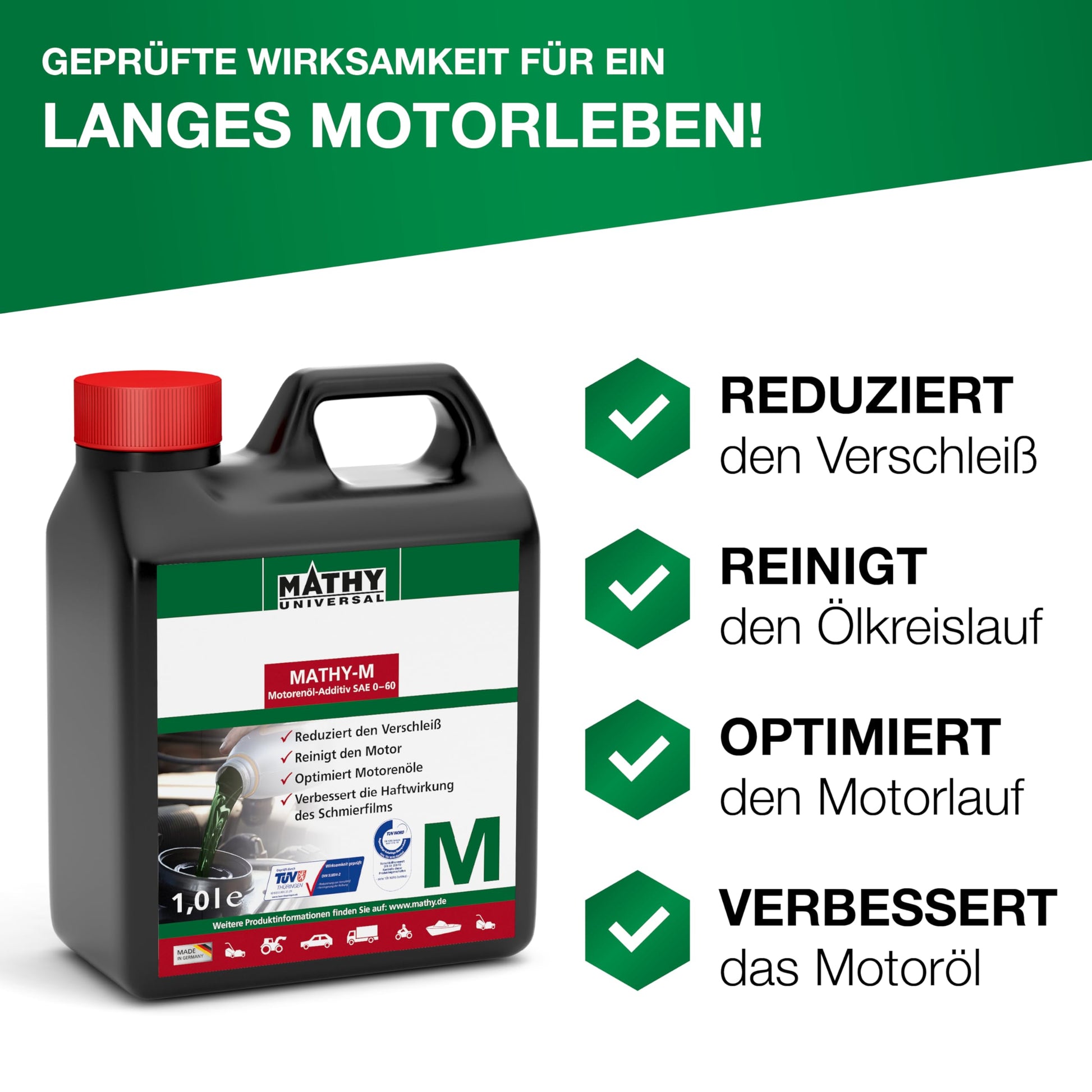 Das MATHY-M Motoröl-Additiv ist ein hochwirksamer, feststofffreier Zusatz, der die Eigenschaften Ihres Motoröls markant verbessert und die Langlebigkeit des Motors fördert.