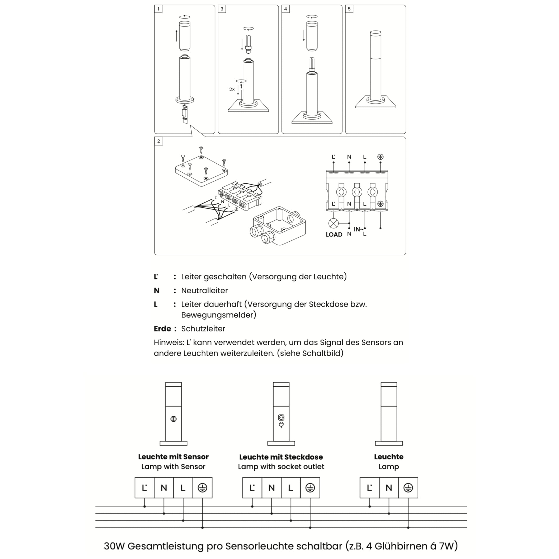 Die Leuchten sind für eine einfache Reihenschaltung (Durchgangsverdrahtung) vorbereitet. Dies ermöglicht es Ihnen, das Stromkabel an der ersten Leuchte anzuschliessen und von dort aus unkompliziert ein Verbindungskabel zur nächsten Leuchte zu führen. Das vereinfacht die Installation und Verkabelung im Garten erheblich.