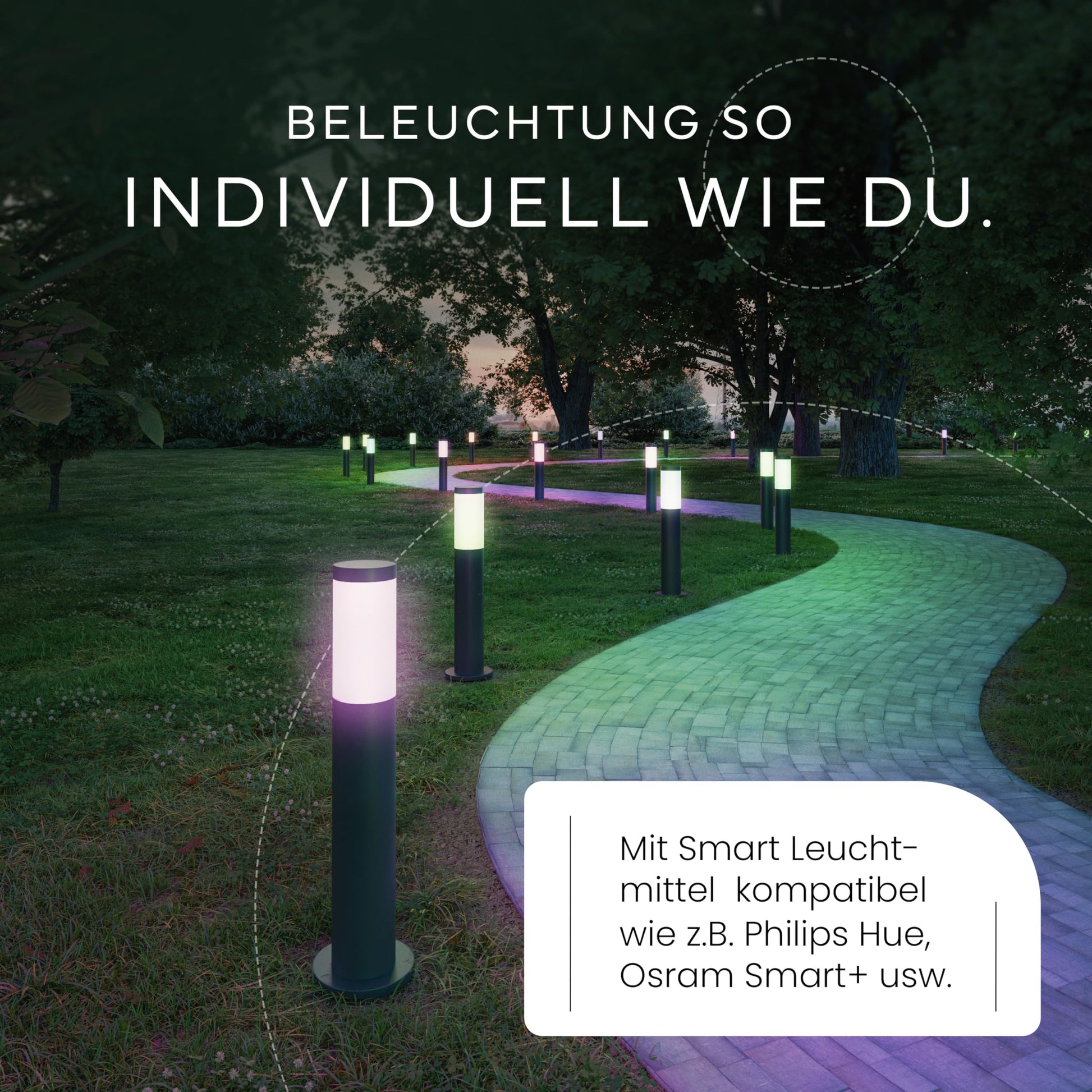 - Zeitloses Design: Die Pollerleuchten in elegantem Anthrazit und mit einer Höhe von 50 cm fügen sich dank ihres schlichten, modernen Aussehens nahtlos in jede Umgebung ein und werten diese optisch auf.
