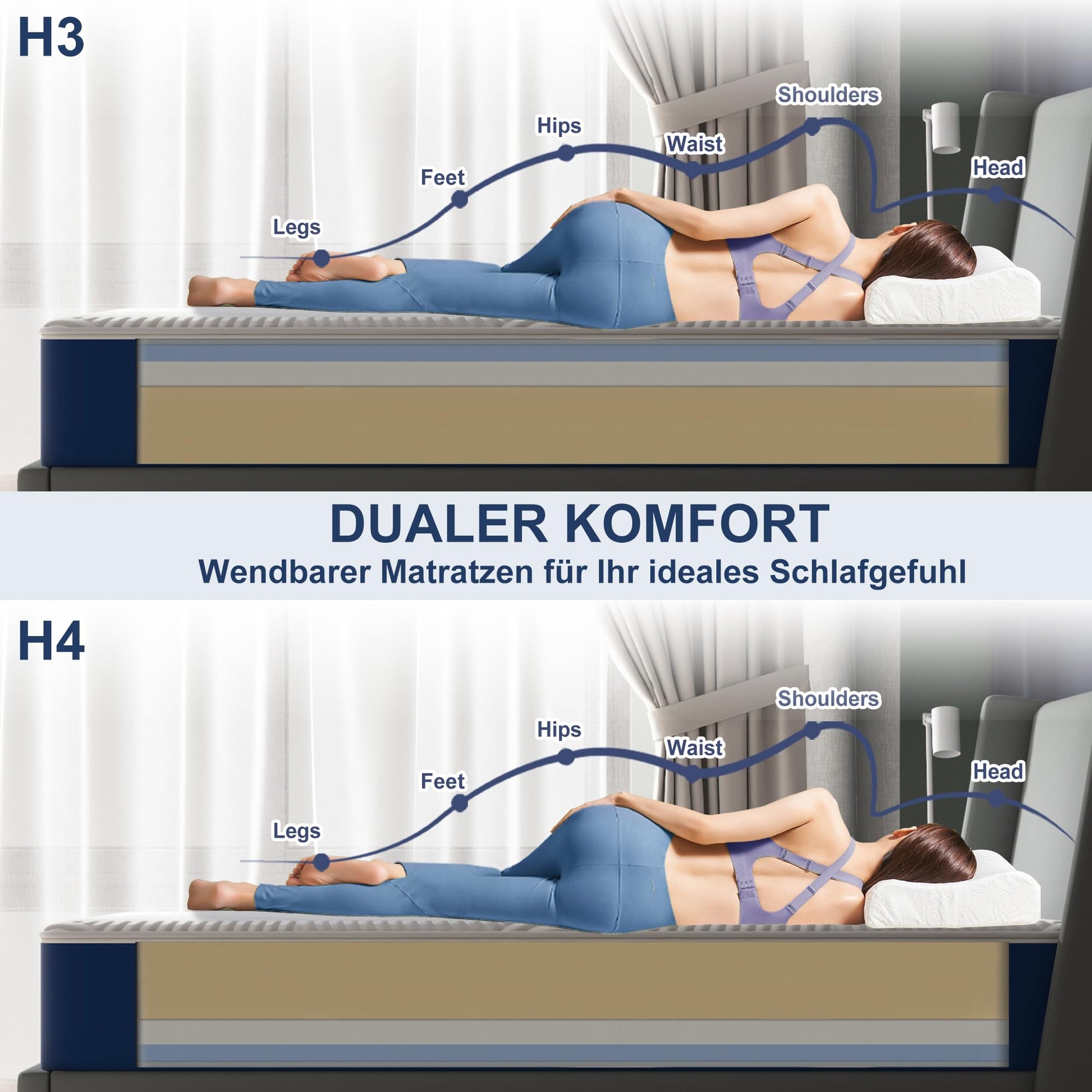 - Zwei Härtegrade in einer Matratze: Dank des cleveren, wendbaren Designs können Sie flexibel zwischen der weicheren H3-Seite und der festeren H4-Seite wählen – ganz nach Ihren persönlichen Vorlieben.