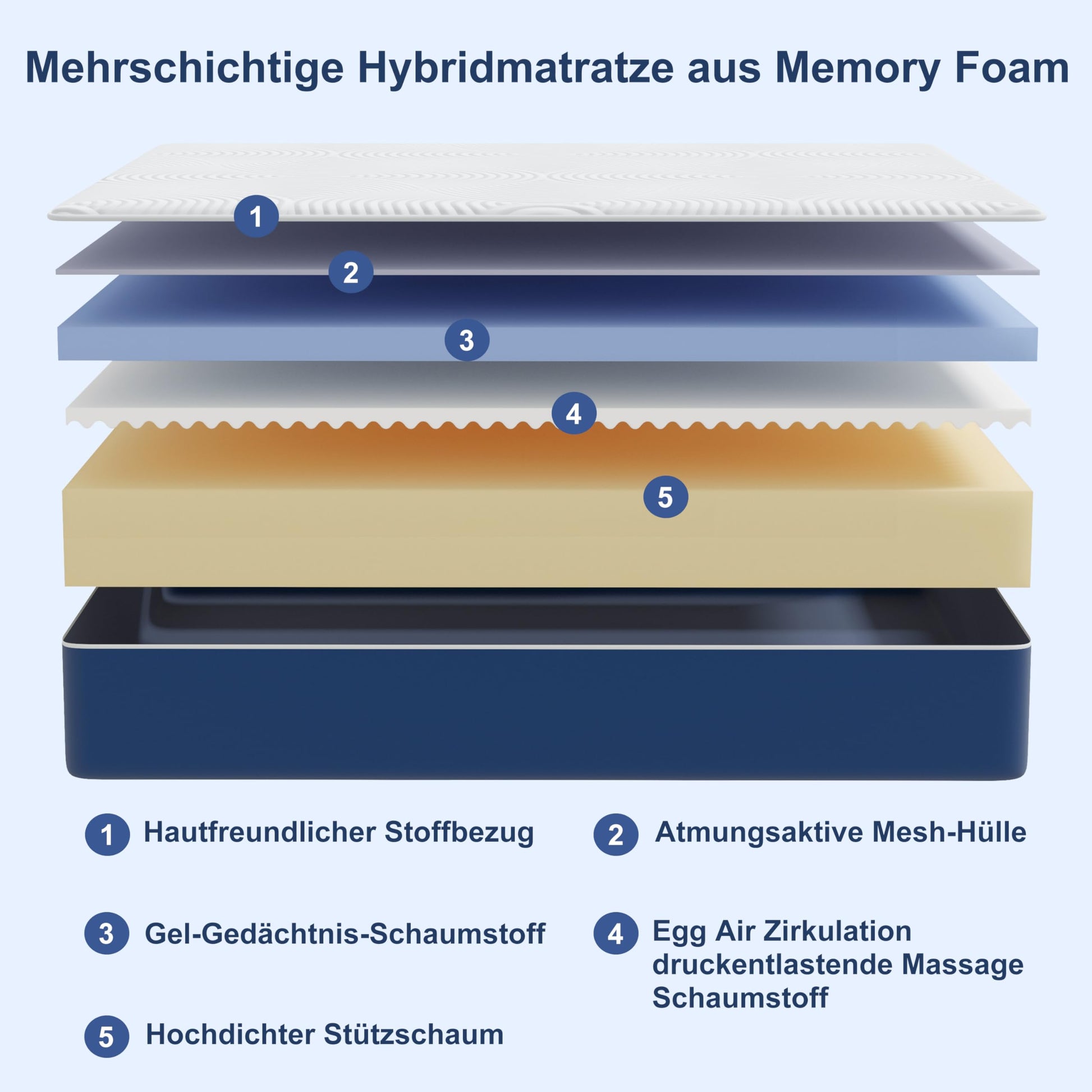 - Innovatives Drei-Schicht-System: Eine Kombination aus kühlendem Gel-Memory-Schaum, komfortablem Memory-Schaum und einer stabilisierenden Basisschicht sorgt für eine perfekte Körperanpassung und effektive Druckentlastung.
