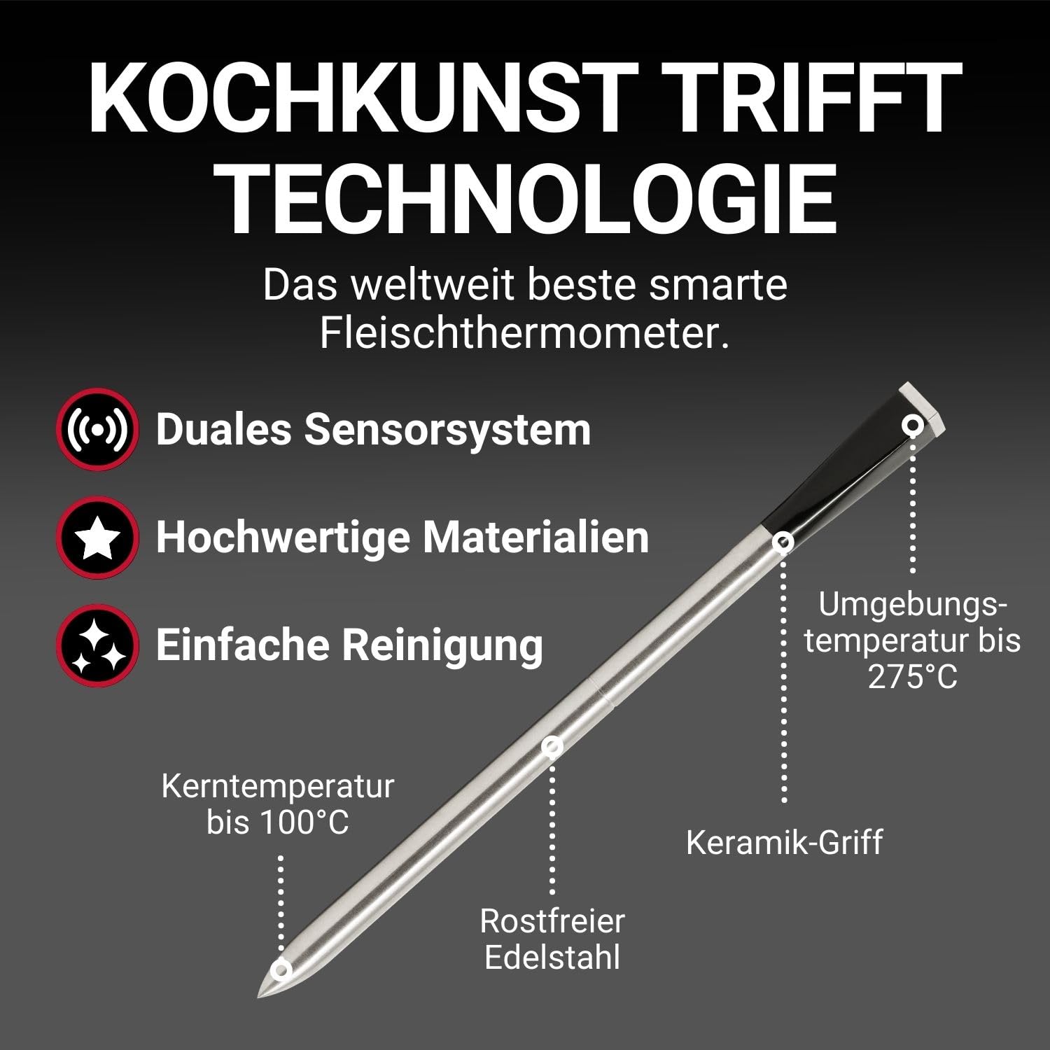 - Duale Sensortechnik: Ein Fühler mit zwei Sensoren überwacht gleichzeitig die Kerntemperatur im Innern des Fleisches (bis 100°C) sowie die Umgebungstemperatur (bis 275°C).