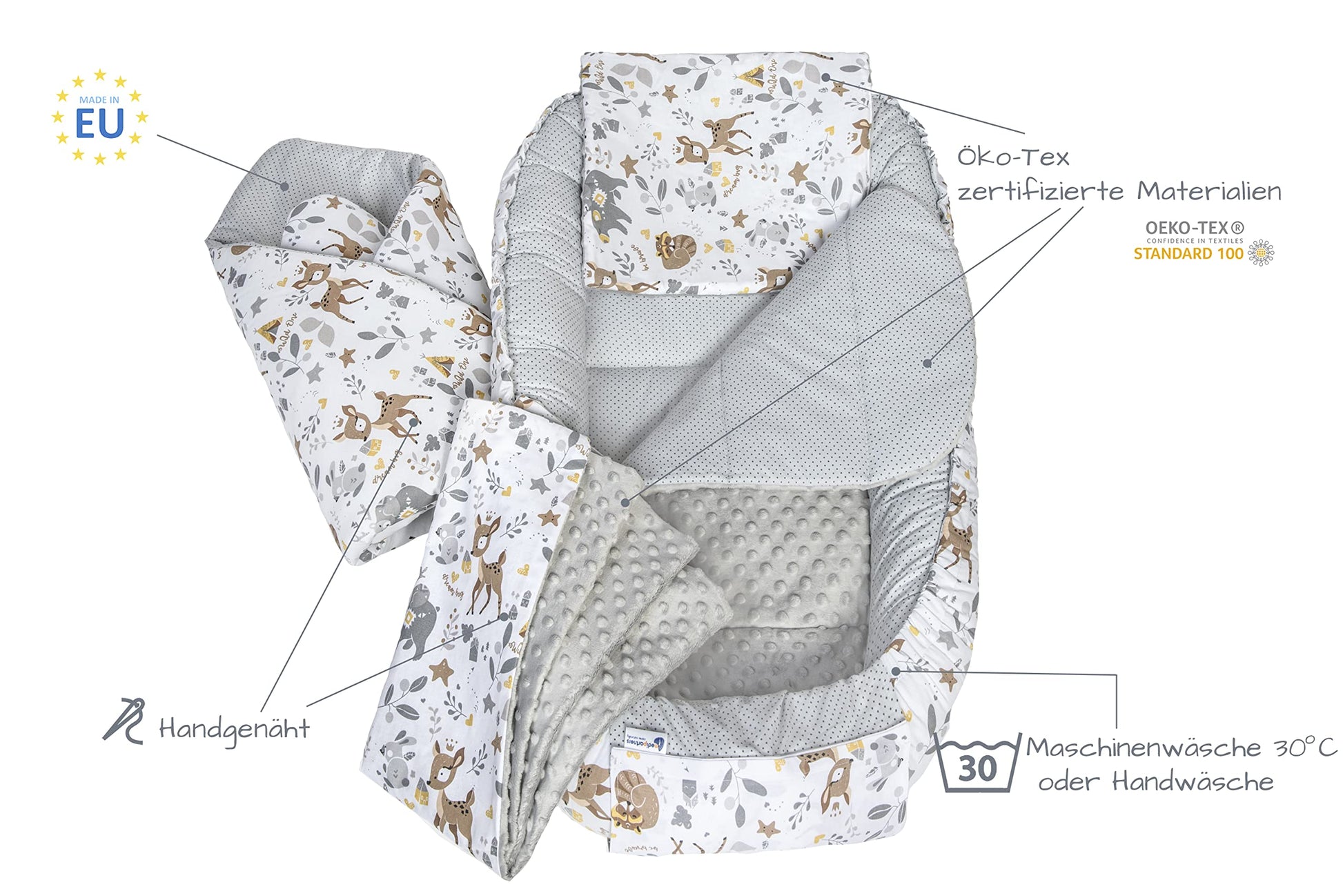 - Europäische Handarbeit: Das Nestchen wird sorgfältig von Hand in Polen genäht, was eine hohe Qualität sicherstellt.