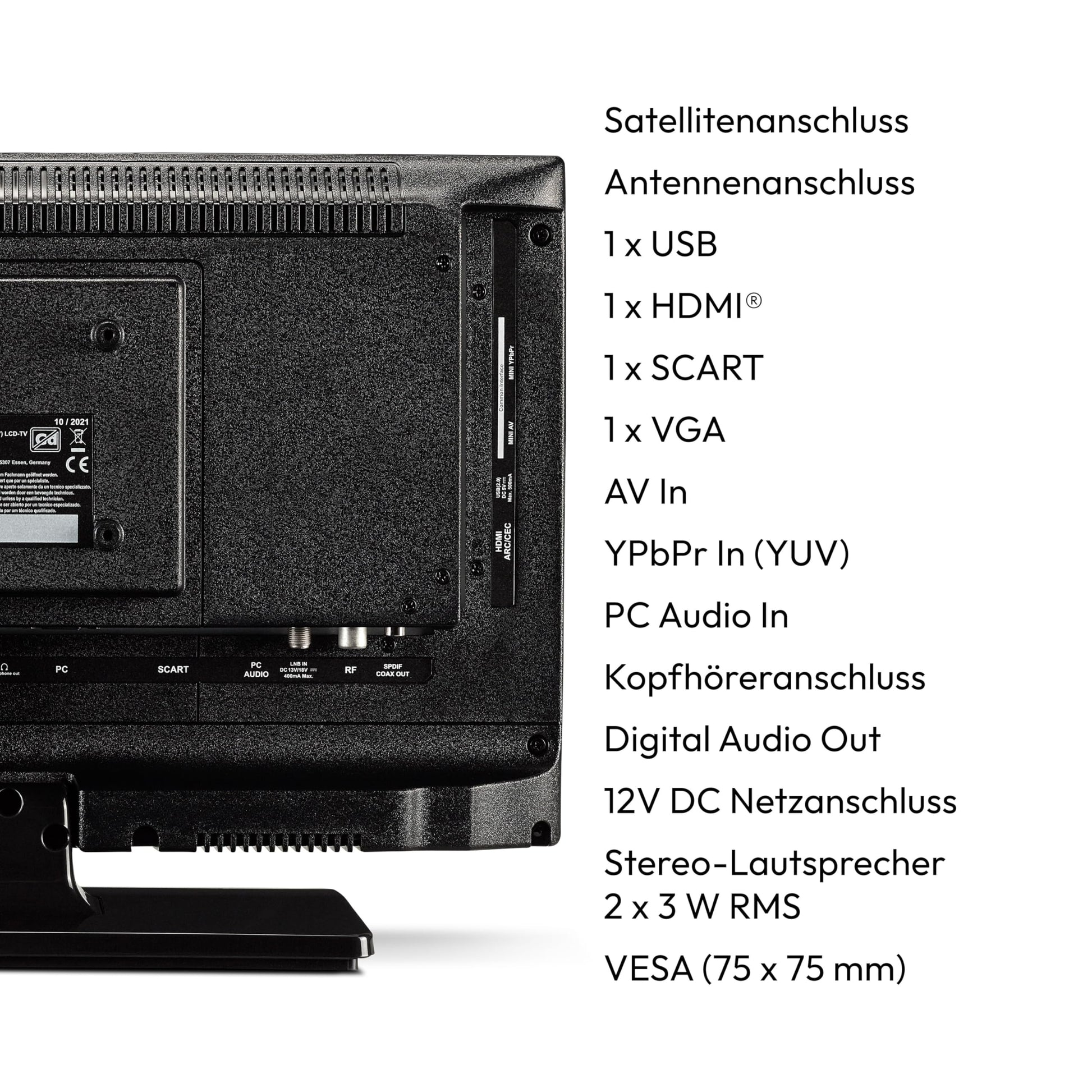 Das Gerät ist als Komplettpaket konzipiert und sofort einsatzbereit. Im Lieferumfang finden Sie alles, was Sie für den Start benötigen: den Fernseher mit Standfuss, eine Fernbedienung mit Batterien, sowohl ein normales Netzteil als auch den 12V-Adapter für Fahrzeuge und sogar eine DVB-T Antenne.