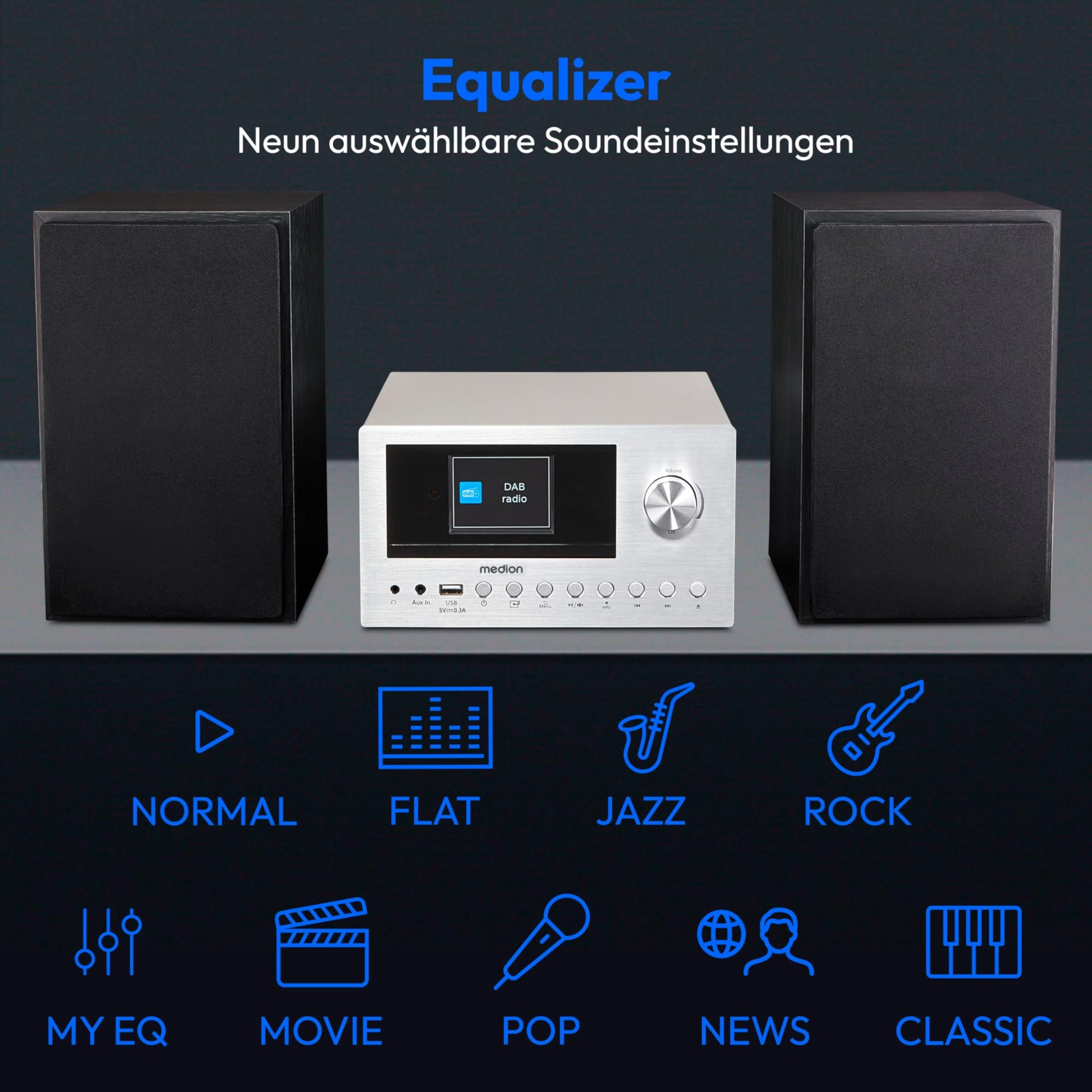 Dank der zahlreichen Anschlussmöglichkeiten und Wiedergabeformate von CD bis USB-Stick wird diese Kompaktanlage zur zentralen Anlaufstelle für all Ihre Audioquellen. Passen Sie das Klangerlebnis mit den verschiedenen Equalizer-Einstellungen perfekt an Ihr Lieblingsgenre an und erleben Sie Musik genau so, wie sie klingen soll.