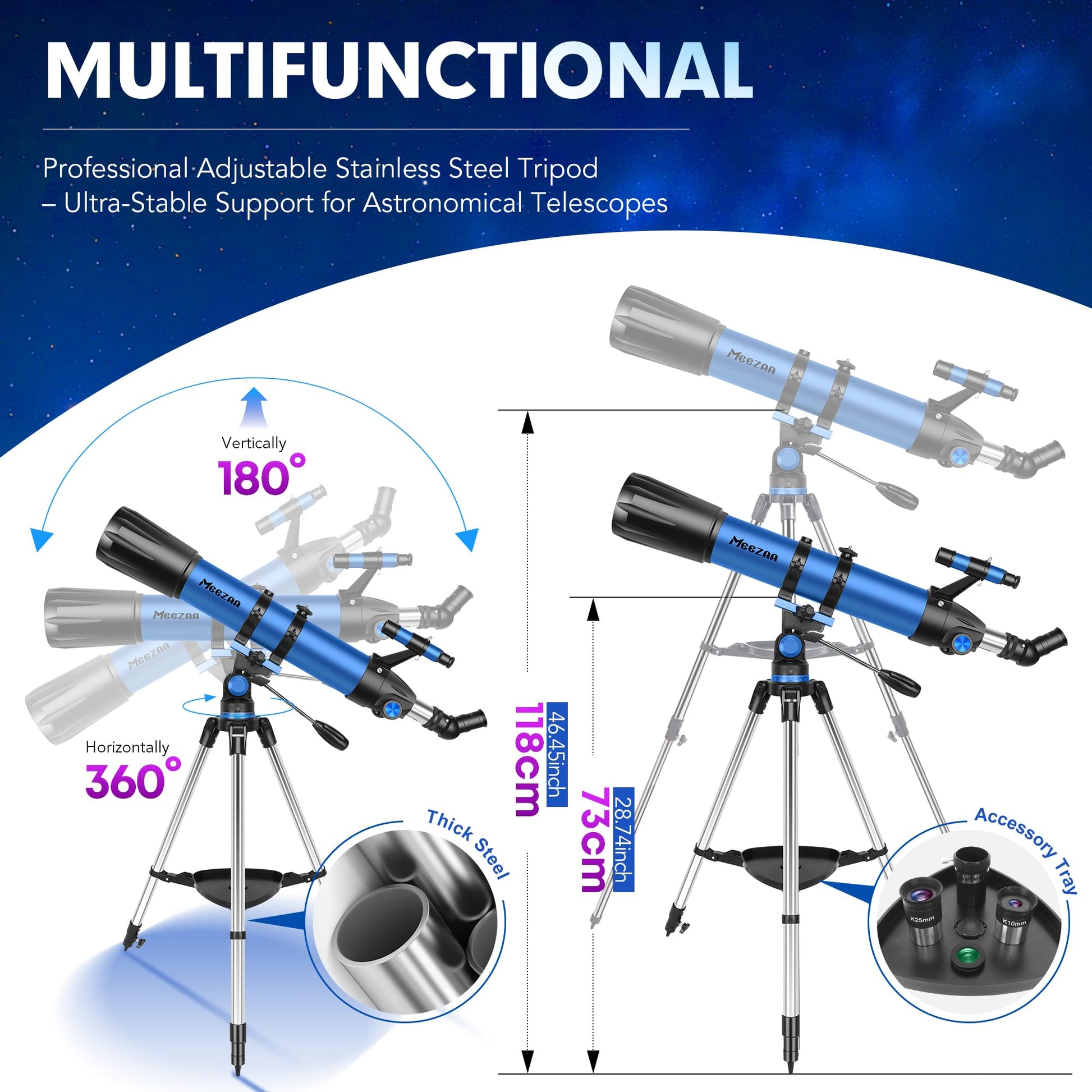 - Stabiles Stativ: Das robuste Edelstahlstativ lässt sich von 73 cm bis 118 cm in der Höhe verstellen und bietet einen sicheren Stand für wackelfreie Beobachtungen.