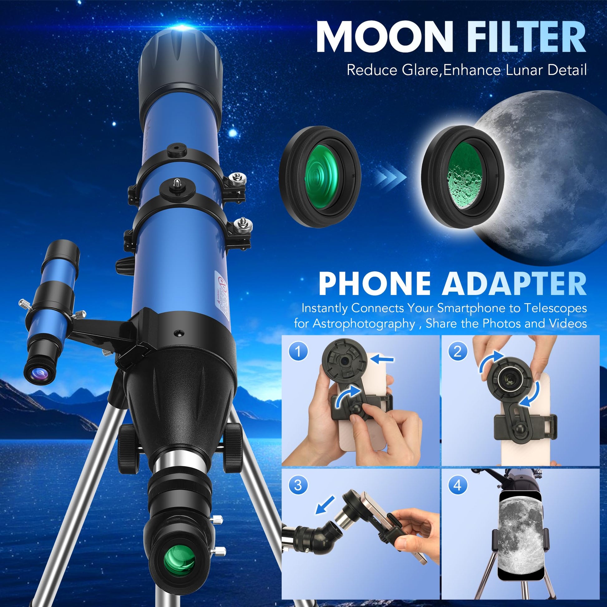 - Umfangreiches Zubehör: Das Set beinhaltet einen Smartphone-Adapter für Astrofotografie, einen Mondfilter zur Reduzierung von Blendung sowie eine praktische Transporttasche für alle Komponenten.