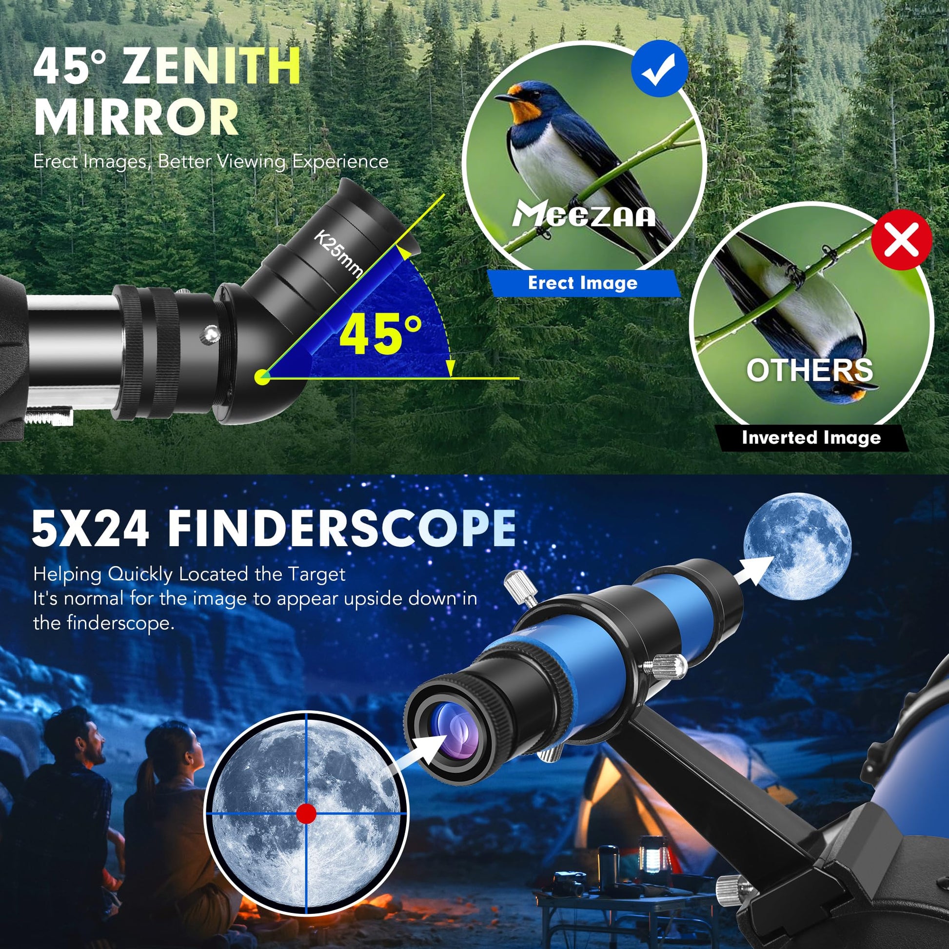 - Anwenderfreundliche Ausrichtung: Das 5x24 Sucherfernrohr erleichtert das Anvisieren von Himmelsobjekten, während der 45-Grad-Zenitspiegel für ein aufrechtes und seitenrichtiges Bild sorgt.