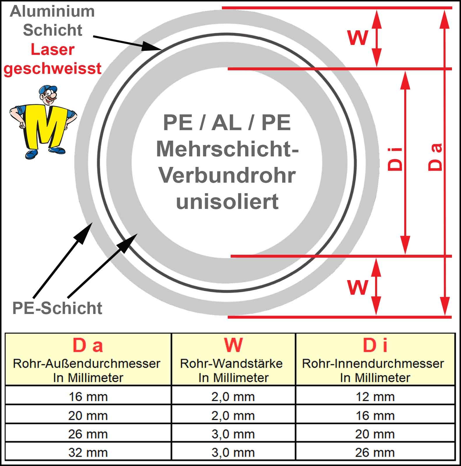 Der entscheidende Vorteil ist die Kombination aus Stabilität und Langlebigkeit. Die lasergeschweisste Aluminiumschicht macht das Rohr extrem formstabil, druckbeständig und widerstandsfähig gegen Korrosion und Rissbildung. Dies sorgt für eine sichere, wartungsarme Installation mit maximaler Lebensdauer.