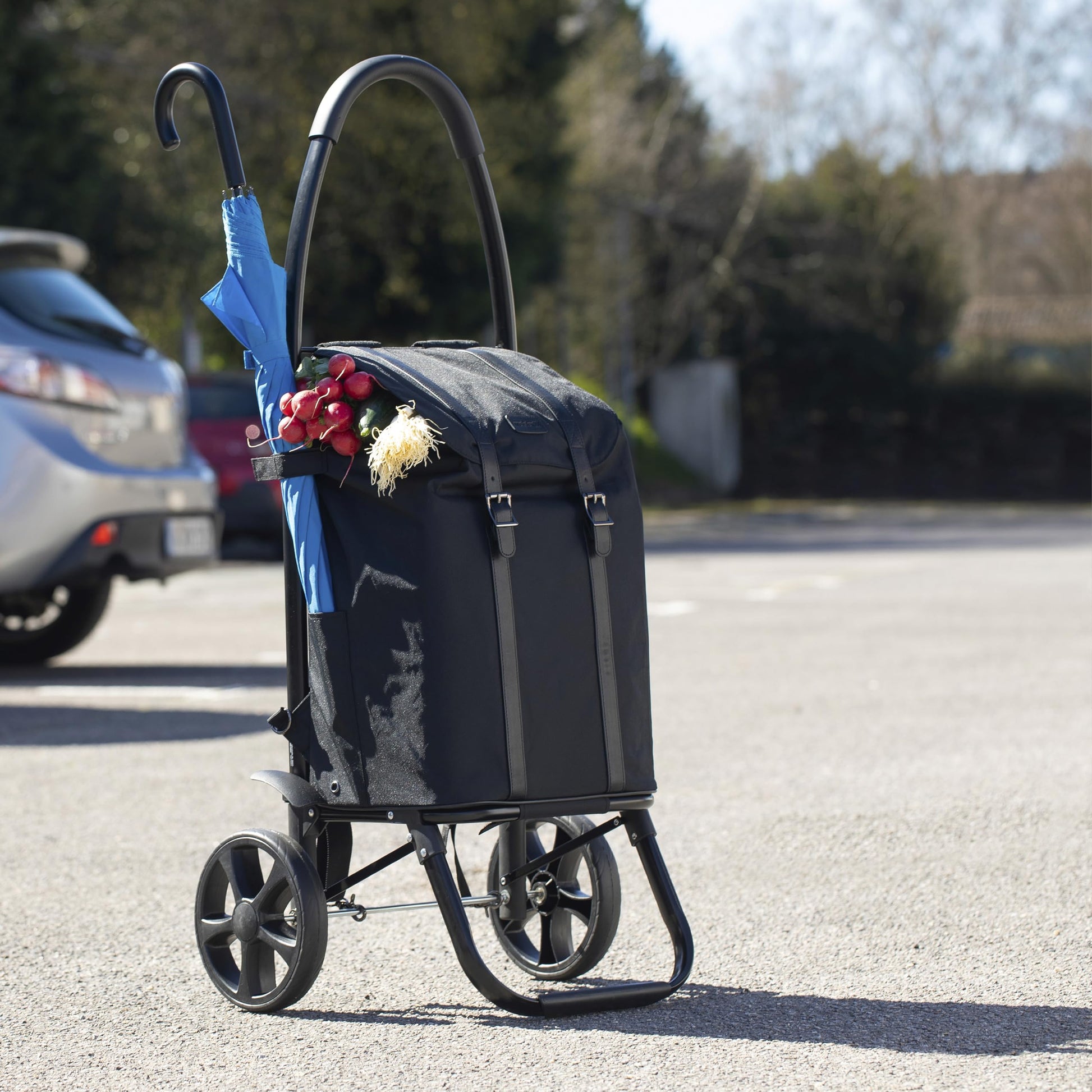 Ja, dafür ist er ideal. Das Gestell kann als Sackkarre mit einer maximalen Tragfähigkeit von 20 kg verwendet werden, perfekt für den mühelosen Transport von Getränkekisten oder anderen sperrigen Einkäufen. Die grossen, laufruhigen Räder mit 20 cm Durchmesser sorgen dabei für hohen Fahrkomfort.