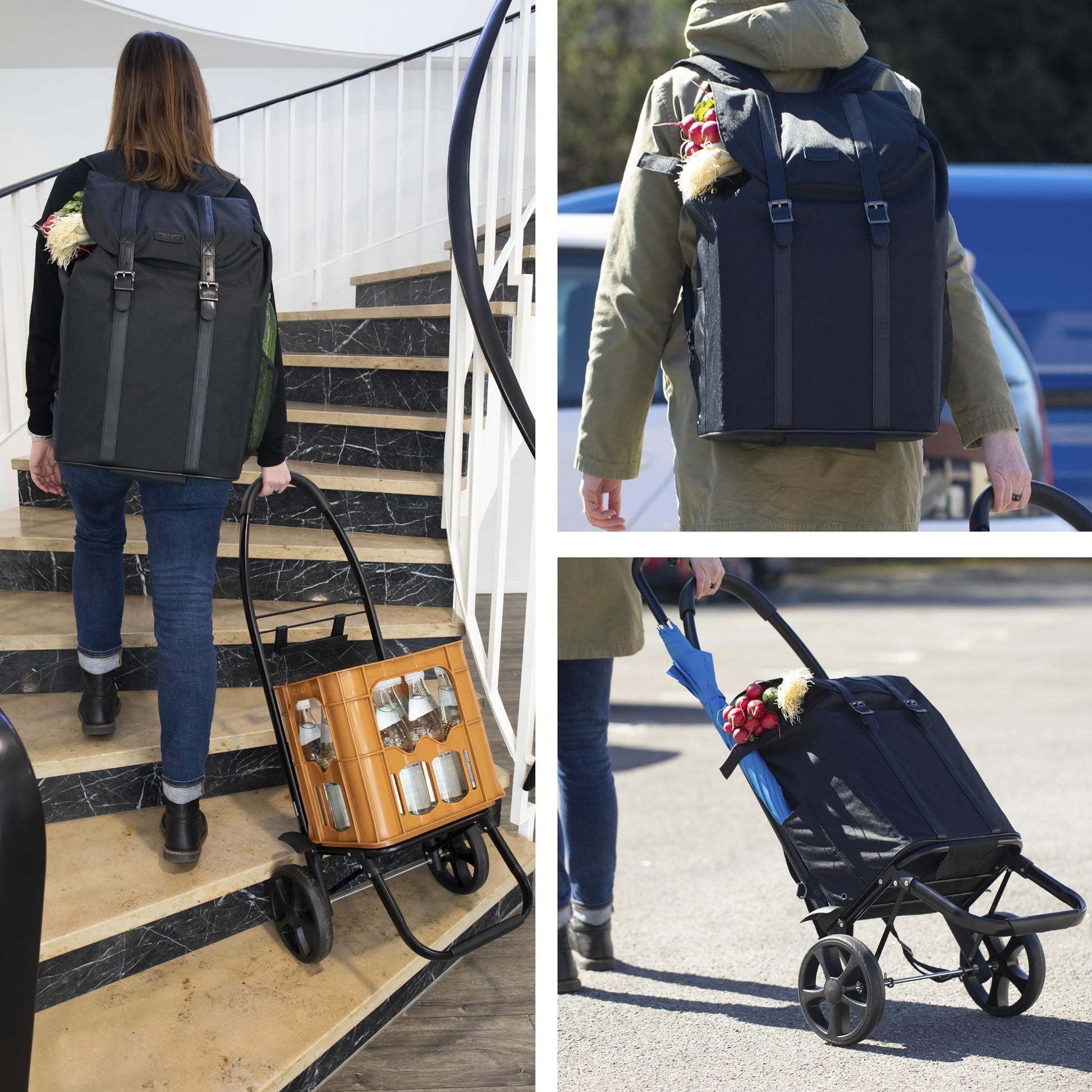 Vergessen Sie das mühsame Schleppen schwerer Taschen. Mit diesem Einkaufshelfer transportieren Sie Lebensmittel, Getränke und andere Besorgungen mühelos und besonders rückenschonend. Die clevere Funktion erlaubt es Ihnen, die Tasche im Handumdrehen in einen praktischen Rucksack zu verwandeln, während das Gestell separat als Sackkarre für Lasten bis 20 kg dient.