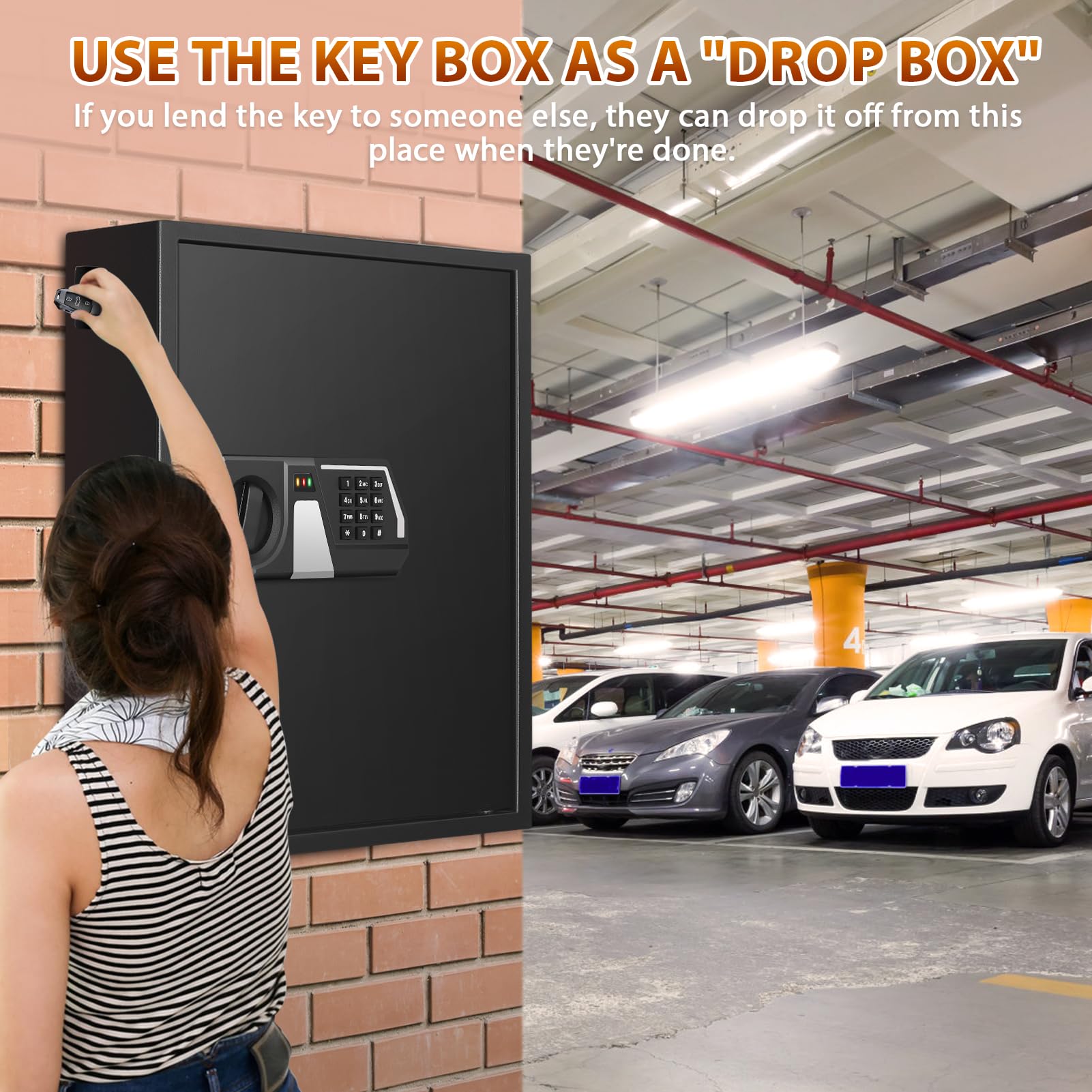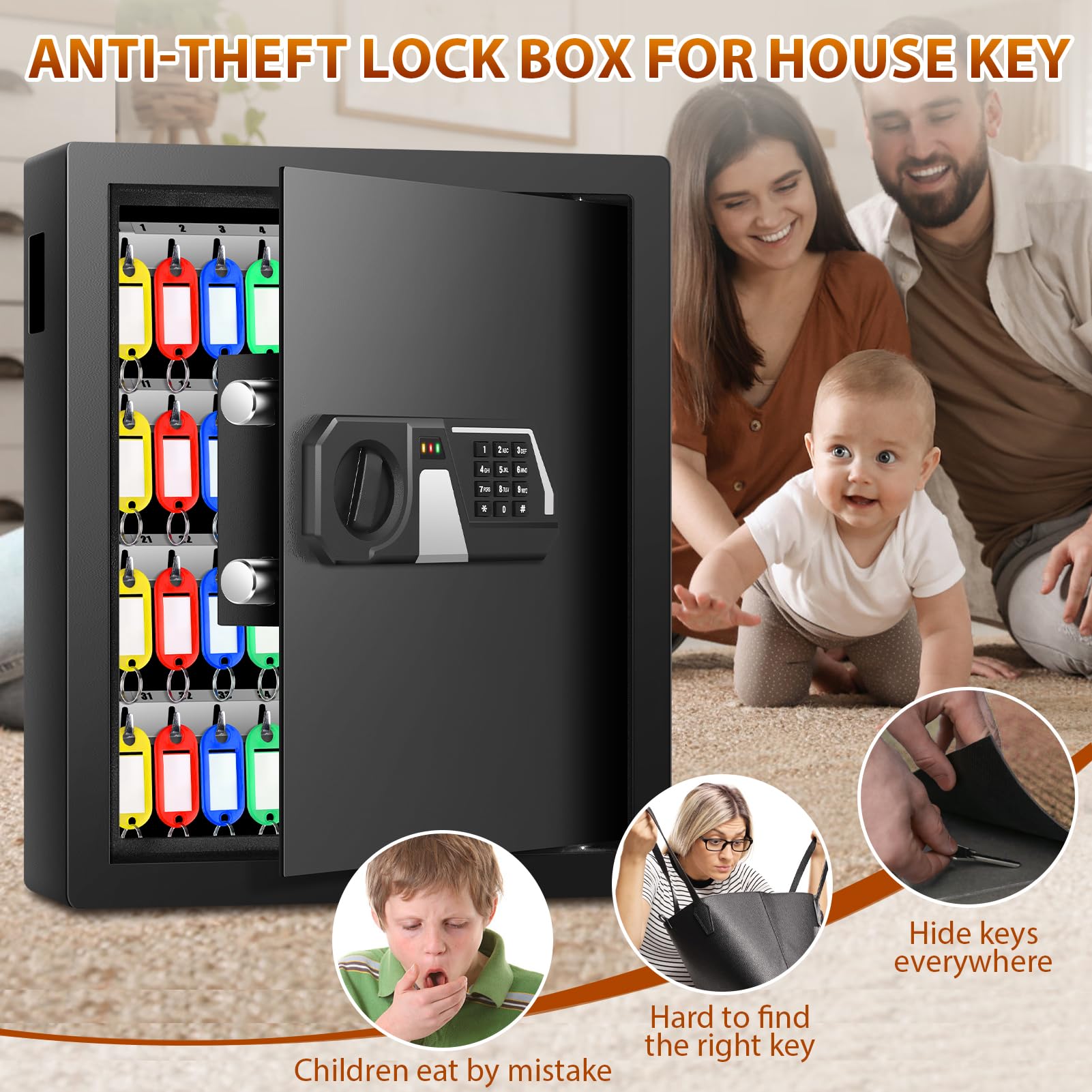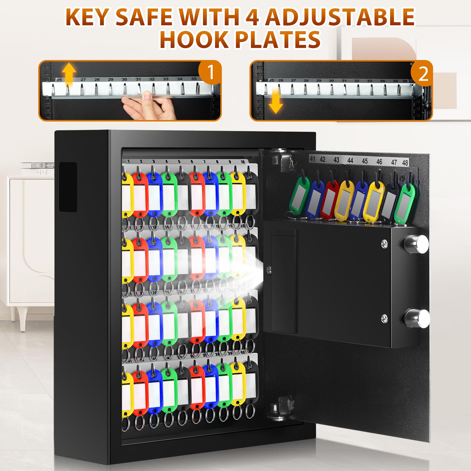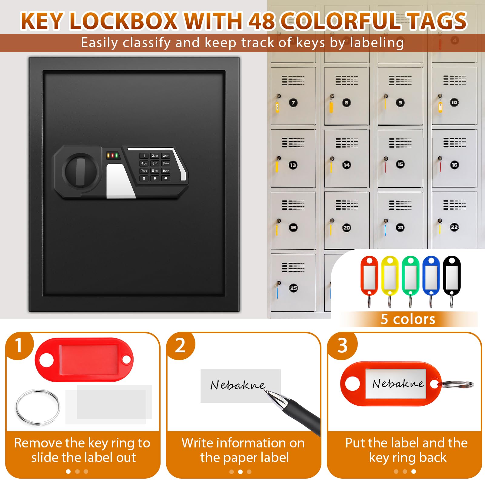 Der Schlüsselkasten bietet Platz für bis zu 48 Schlüssel. Im Lieferumfang finden Sie alles für den sofortigen Einsatz: den Schlüsseltresor, 4 verstellbare Schlüsselleisten, 48 farbige Schlüsselanhänger, 2 Notschlüssel, ein externes Batteriefach sowie das Montagematerial und ein Benutzerhandbuch.