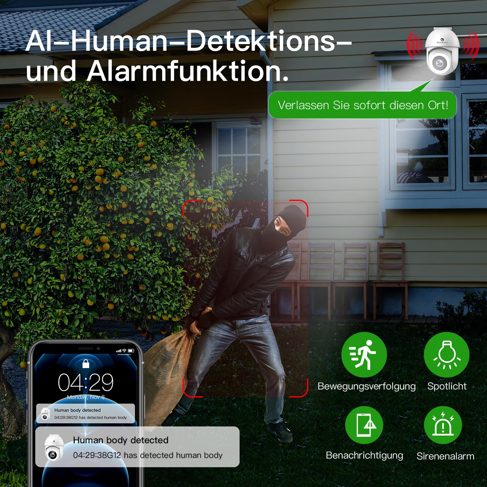 Die Kamera nutzt intelligente Algorithmen, um gezielt menschliche Bewegungen von anderen Ereignissen wie fallenden Blättern oder Tieren zu unterscheiden. Dadurch werden Fehlalarme erheblich reduziert. Sobald eine Person erkannt wird, erhalten Sie sofort eine präzise Benachrichtigung auf Ihr Smartphone und können in Echtzeit reagieren.
