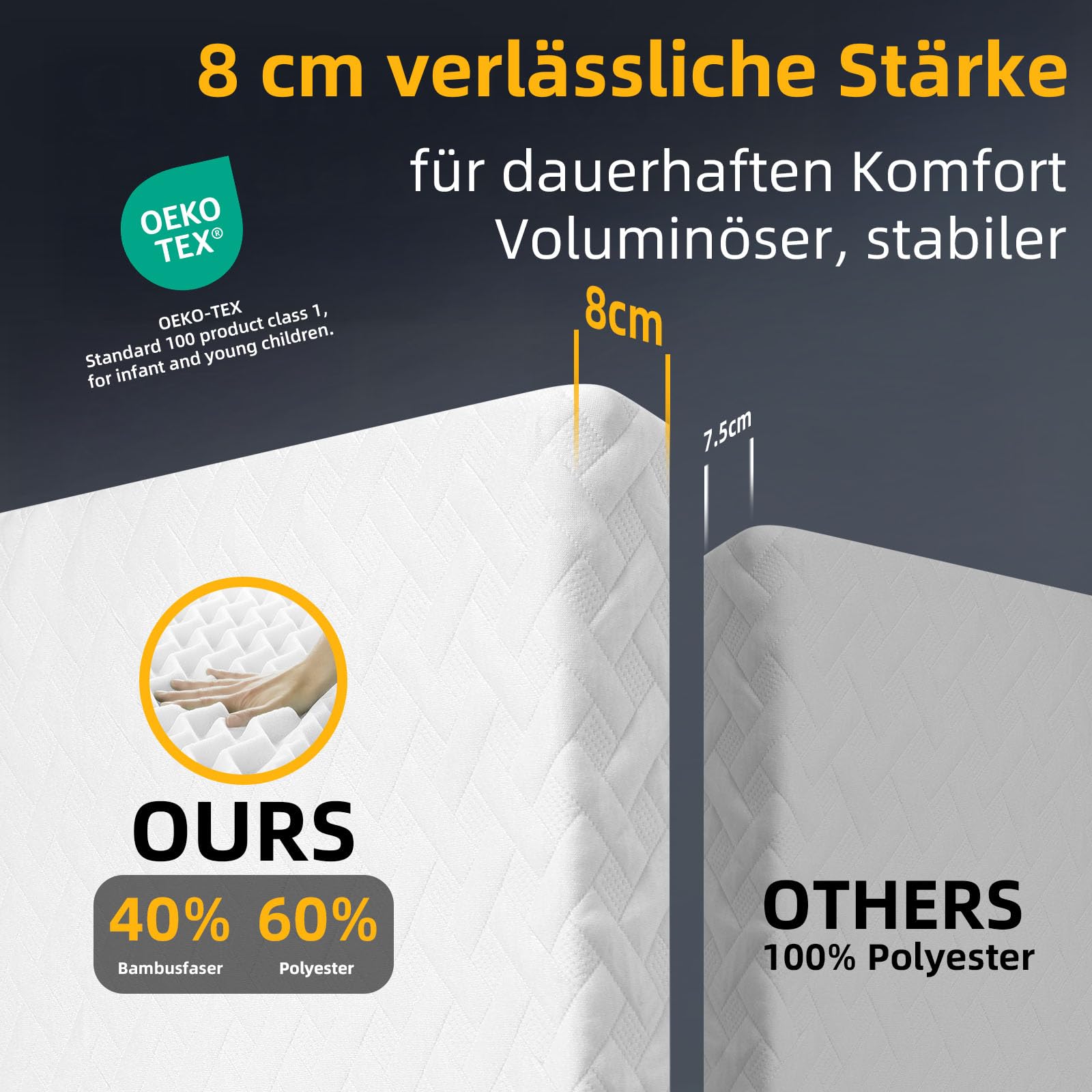 Absolut. Der atmungsaktive Bezug aus natürlichen Bambusfasern reguliert Feuchtigkeit und sorgt für ein konstant frisches, trockenes Schlafklima. Zudem ist der gesamte Topper nach OEKO-TEX Standard 100 (Klasse 1) zertifiziert, was garantiert, dass er frei von Schadstoffen und ideal für Allergiker sowie Personen mit sensibler Haut ist.