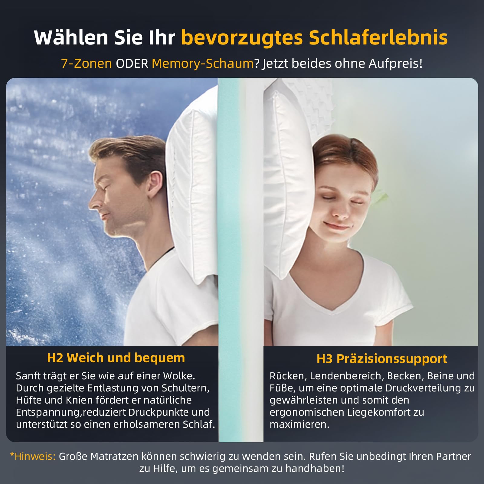 - Ergonomische 7-Zonen-Struktur: Die festere Kaltschaumseite ist in 7 Zonen unterteilt, um eine optimale Druckverteilung zu gewährleisten und die Wirbelsäule korrekt auszurichten.