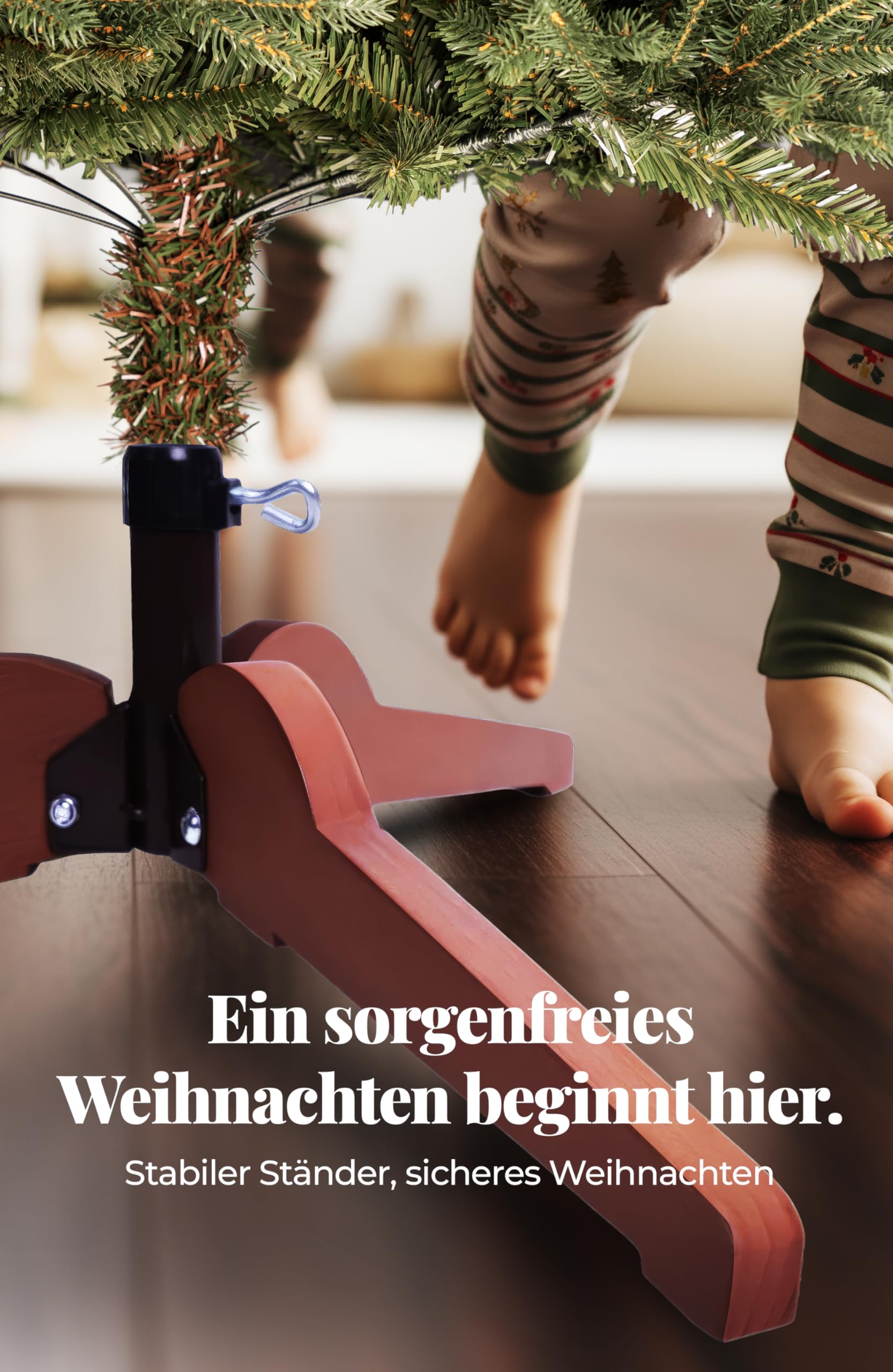 - Stabiler Halt: Der mitgelieferte Holzständer mit vier Beinen sorgt für eine hohe Standfestigkeit und garantiert, dass Ihr geschmückter Baum sicher und ohne zu wackeln steht.