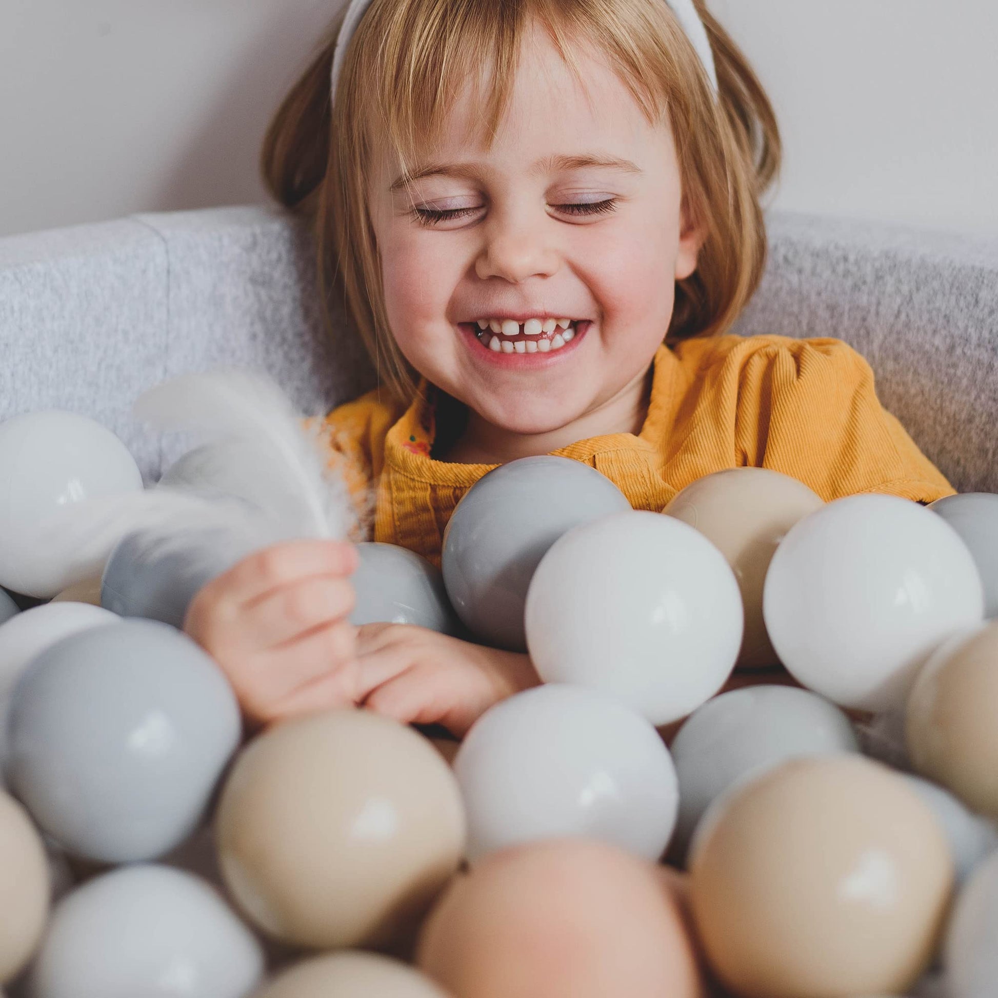 Das Bällebad ist aus hochwertigem, stabilem und dennoch weichem Schaumstoff gefertigt und mit einem samtartigen Bezug überzogen. Diese Materialien sorgen für maximalen Komfort und eine sichere Spielumgebung für Ihr Kind.