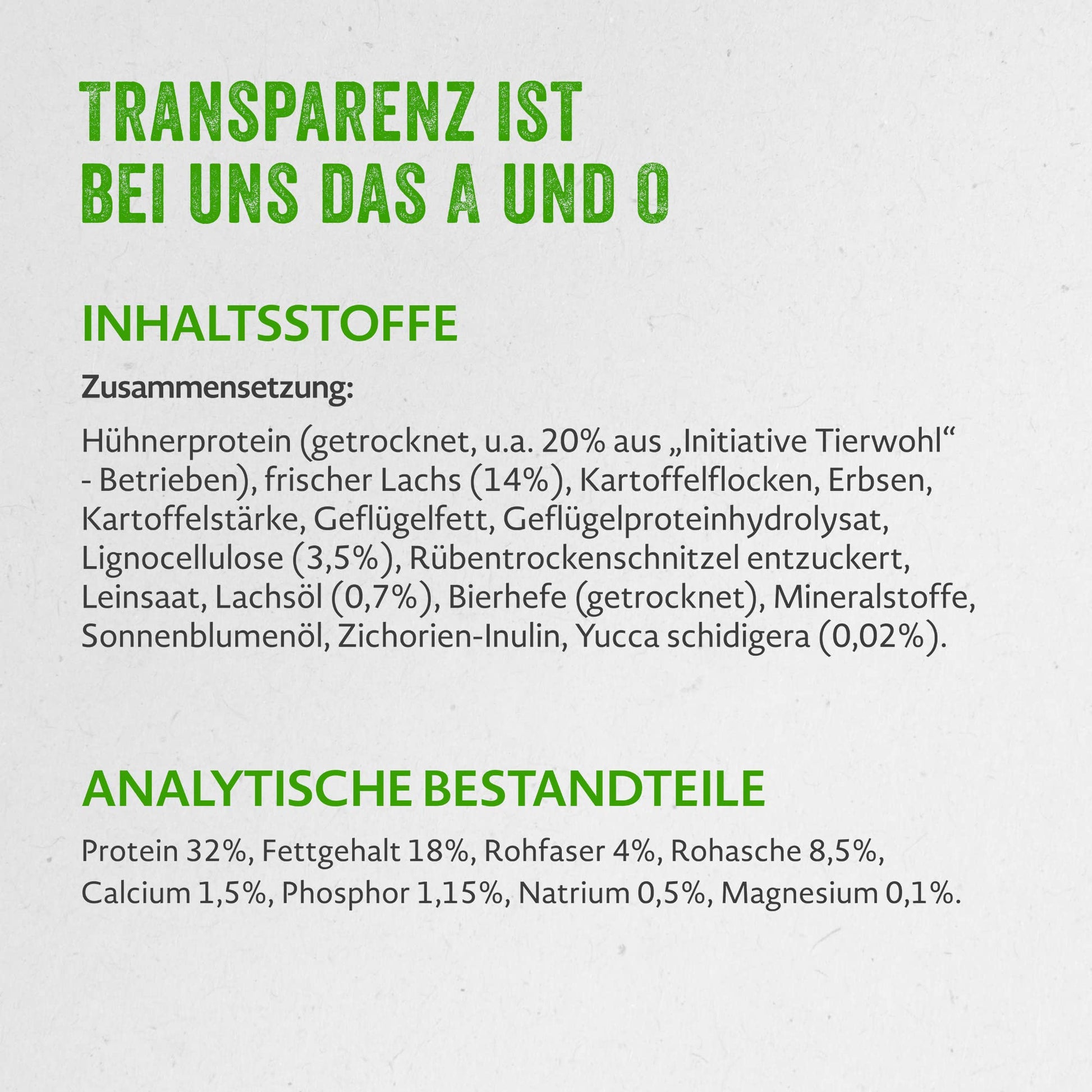 Hühnerprotein (getrocknet, u.a. 20% aus "Initiative Tierwohl" - Betrieben), frischer Lachs (14%), Kartoffelflocken, Erbsen, Kartoffelstärke, Geflügelfett, Geflügelproteinhydrolysat, Lignocellulose (3,5%), Rübentrockenschnitzel entzuckert, Leinsaat, Lachsöl (0,7%), Bierhefe (getrocknet), Mineralstoffe, Sonnenblumenöl, Zichorien-Inulin, Yucca schidigera (0,02%).
