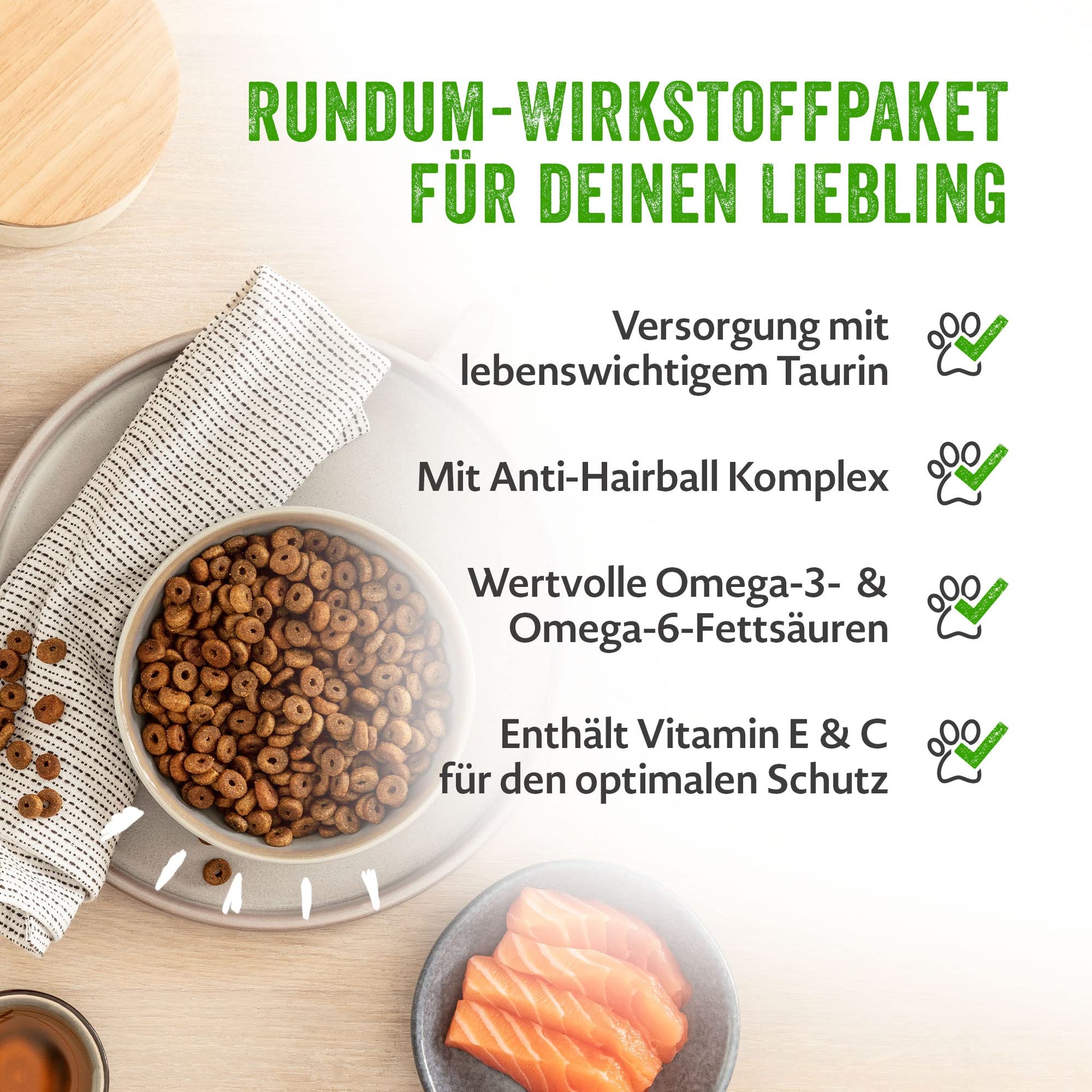 Dieses hochwertige Trockenfutter mit frischem Lachs bietet Ihrer ausgewachsenen Katze eine vollwertige und ausgewogene Ernährung. Die getreidefreie Rezeptur ist speziell auf die Bedürfnisse von Katzen abgestimmt und unterstützt ein langes, vitales Leben.