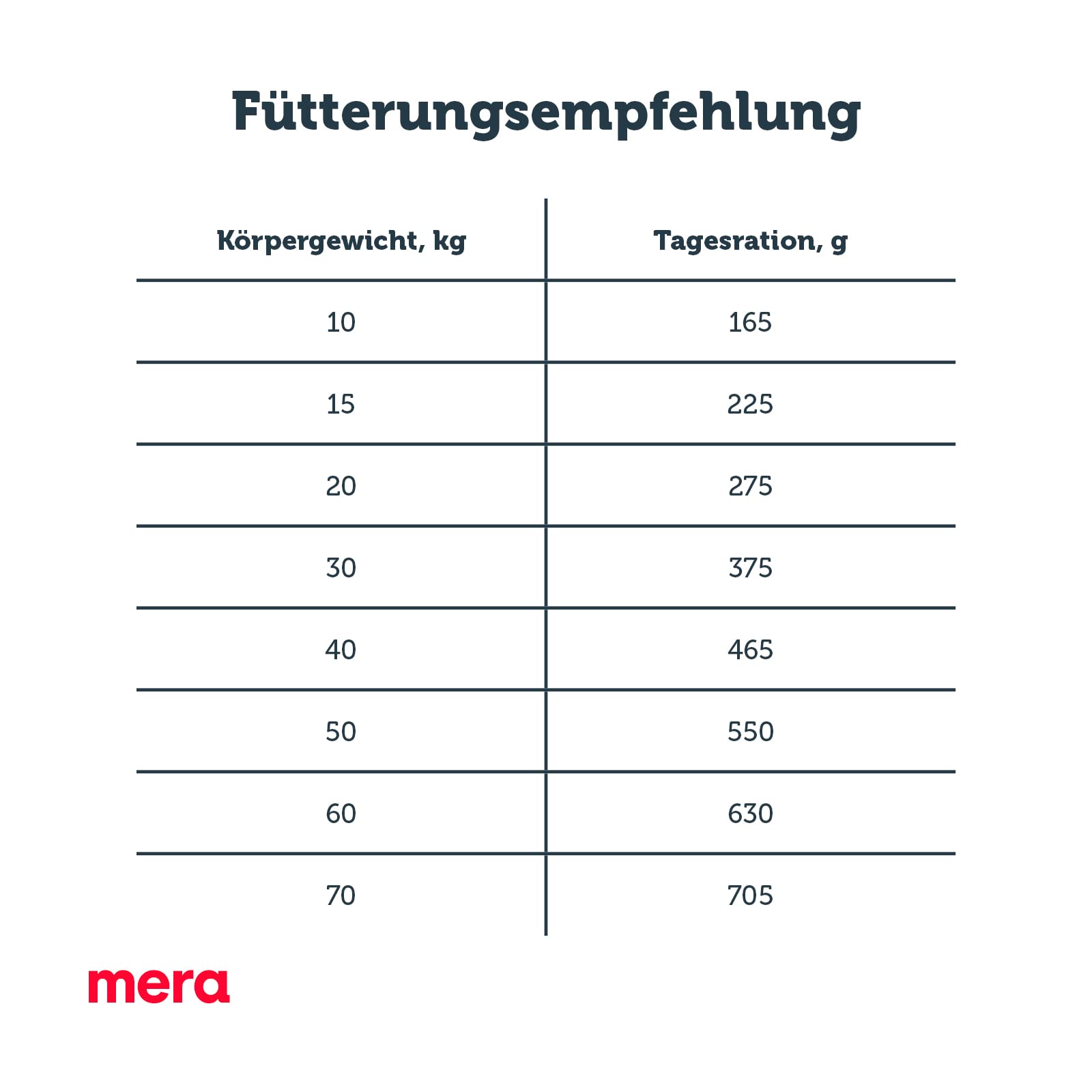 Servieren Sie das Futter im Allgemeinen trocken. Sorgen Sie bitte dafür, dass Ihrem Hund jederzeit frisches Wasser zur Verfügung steht. Die empfohlenen Angaben sind Richtwerte pro Tag, die je nach äusseren Einflüssen und Anlagen des Hundes angepasst werden müssen.
