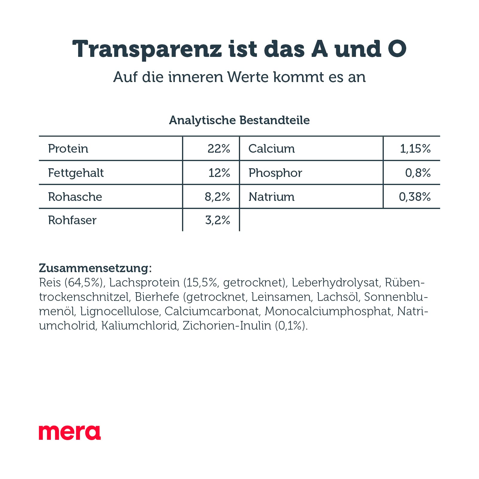 Analytische Bestandteile: Protein 22%, Fettgehalt 12%, Rohfaser 3%, Rohasche 8%, Calcium 1,15%, Phosphor 0,8%, Natrium 0,35%.