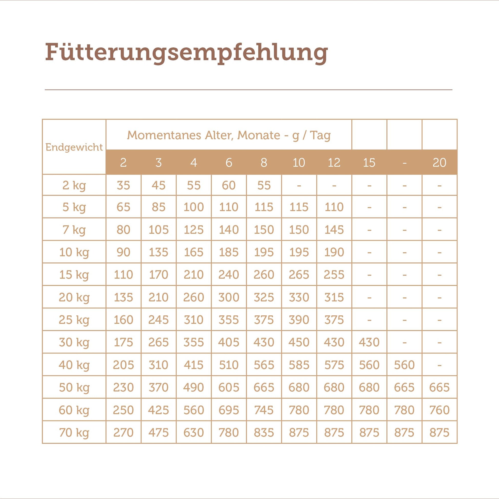 - Optimal auf die Nährstoffbedürfnisse von Welpen in der Wachstumsphase abgestimmt, um eine gesunde Entwicklung zu fördern.