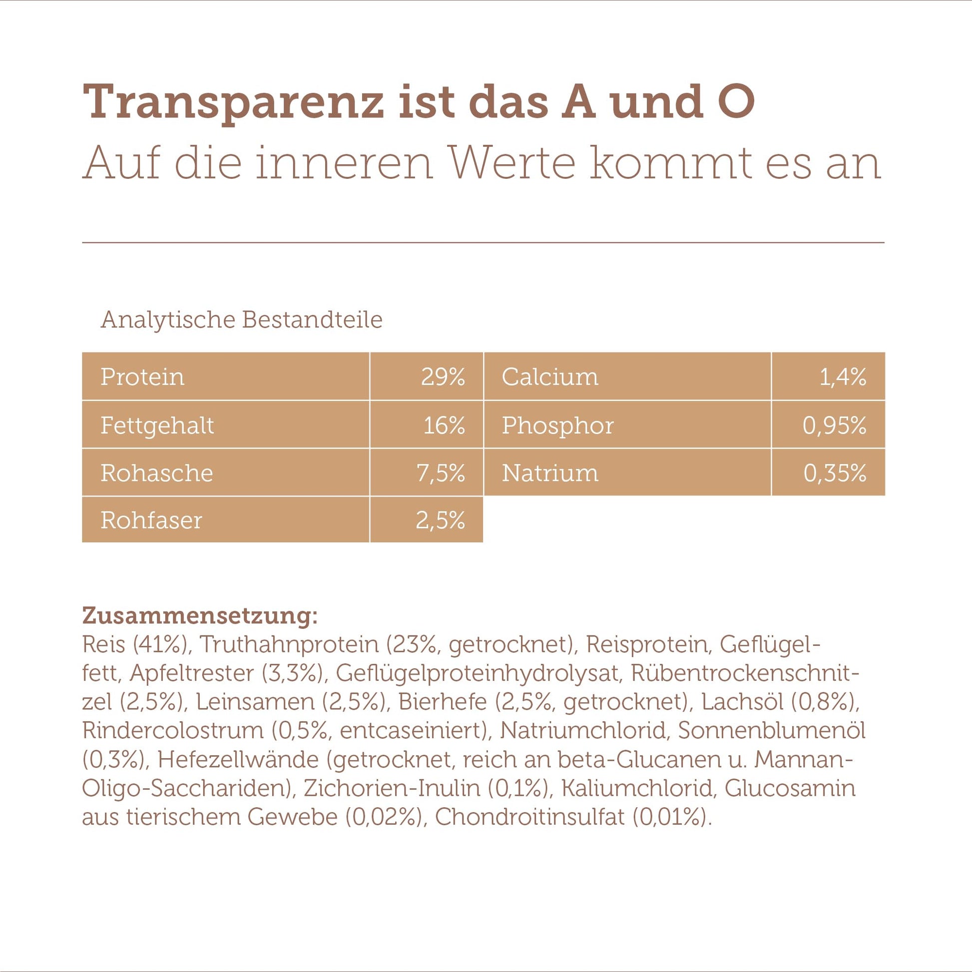 Reis (41%), Truthahnprotein (23%, getrocknet), Reisprotein, Geflügelfett, Apfeltrester (3,3%), Geflügelproteinhydrolysat, Rübentrockenschnitzel (2,5%), Leinsamen (2,5%), Bierhefe (2,5%, getrocknet), Lachsöl (0,8%), Rindercolostrum (0,5%, entcaseiniert), Natriumchlorid, Sonnenblumenöl (0,3%), Hefezellwände (getrocknet, reich an beta-Glucanen u. Mannan-Oligo-Sacchariden), Zichorien-Inulin (0,1%), Kaliumchlorid, Glucosamin aus tierischem Gewebe (0,02%), Chondroitinsulfat (0,01%).