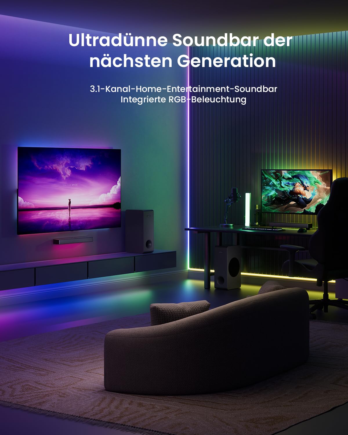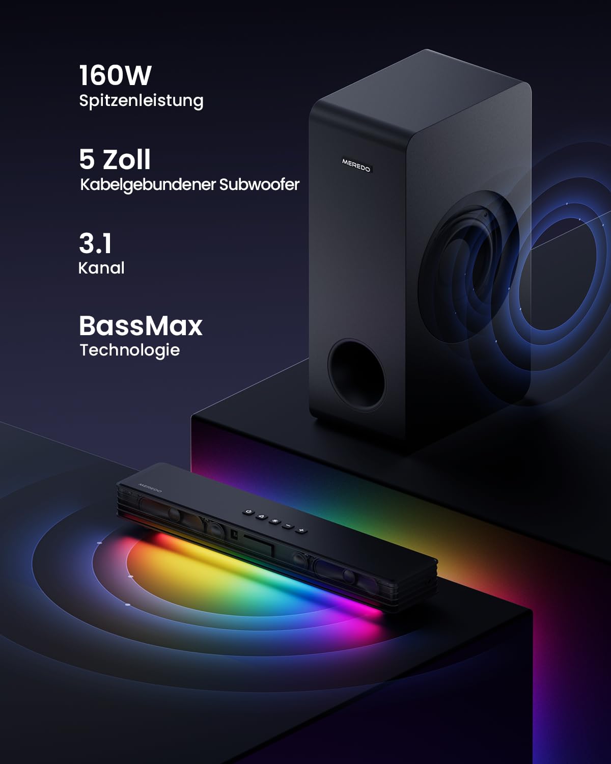MEREDO 3.1 Soundbar mit Subwoofer – Gaming RGB, TV & PC Heimkino