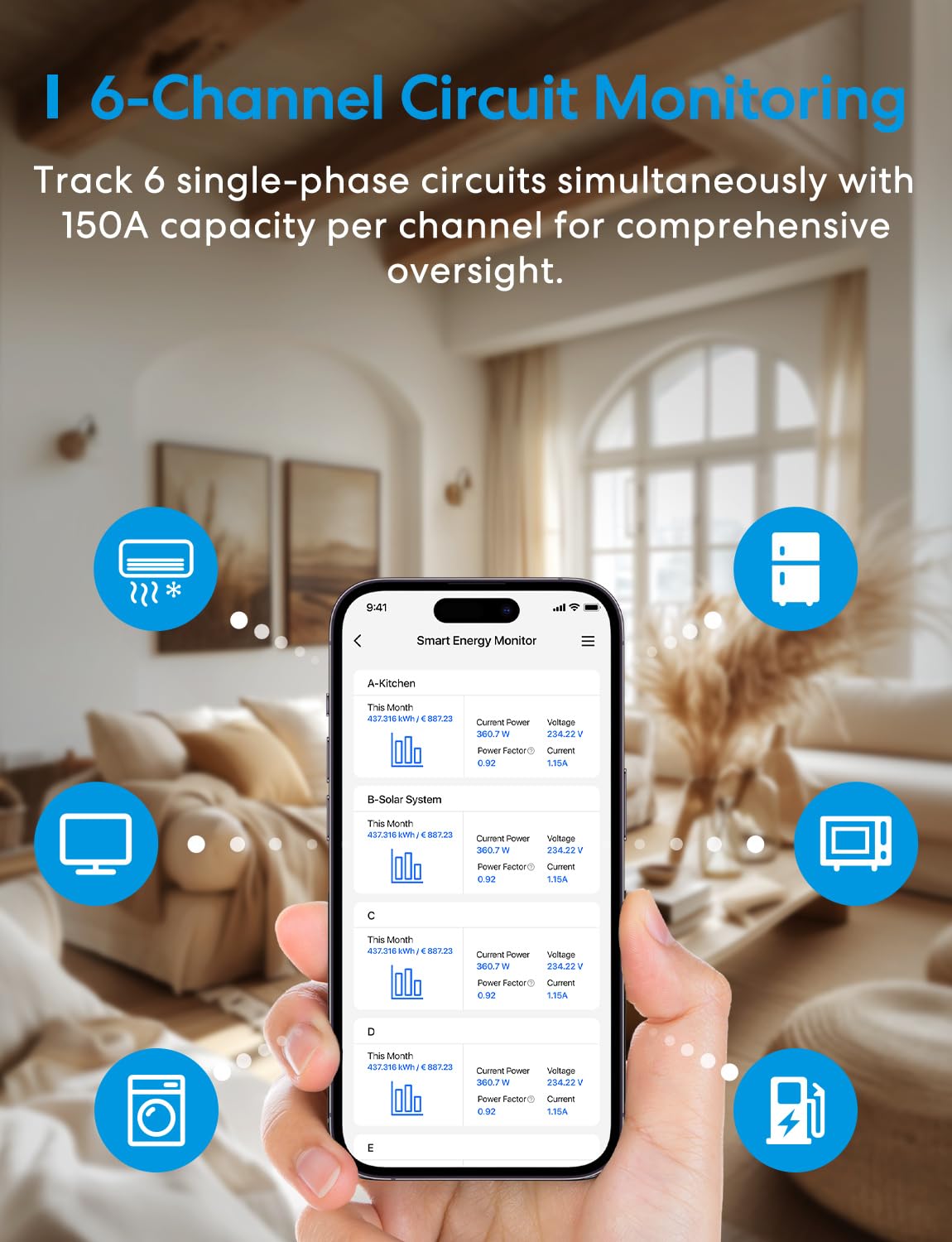 - Flexible 6-Kanal-Überwachung: Misst wahlweise 2× Dreiphasen-, 1× Dreiphasen- plus 3× Einphasen- oder 6× Einphasen-Stromkreise. Jeder Kanal liefert präzise Echtzeitdaten zu Leistung, Spannung und Stromstärke mit 1 % Genauigkeit.