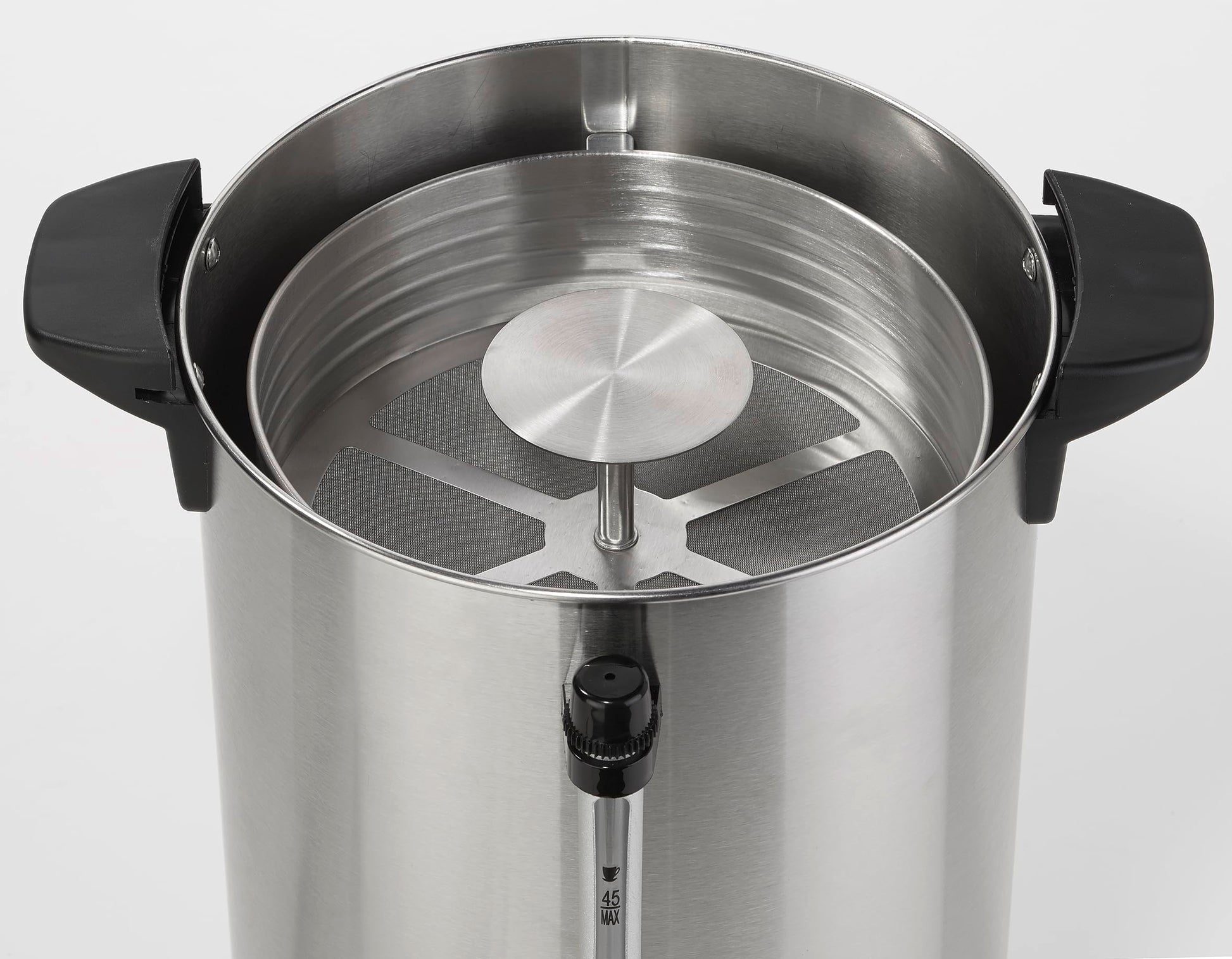 Sie ist ideal für den professionellen Einsatz mit hohem Kaffeebedarf, wie in der Gastronomie, in Kantinen, Büros oder bei Veranstaltungen. Mit einer Kapazität von 6.75 Litern können bis zu 45 Tassen Kaffee in einem Durchgang zubereitet werden.