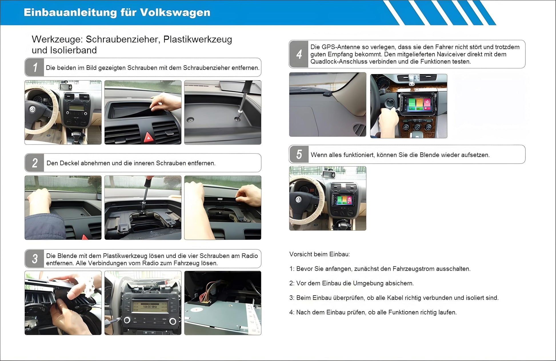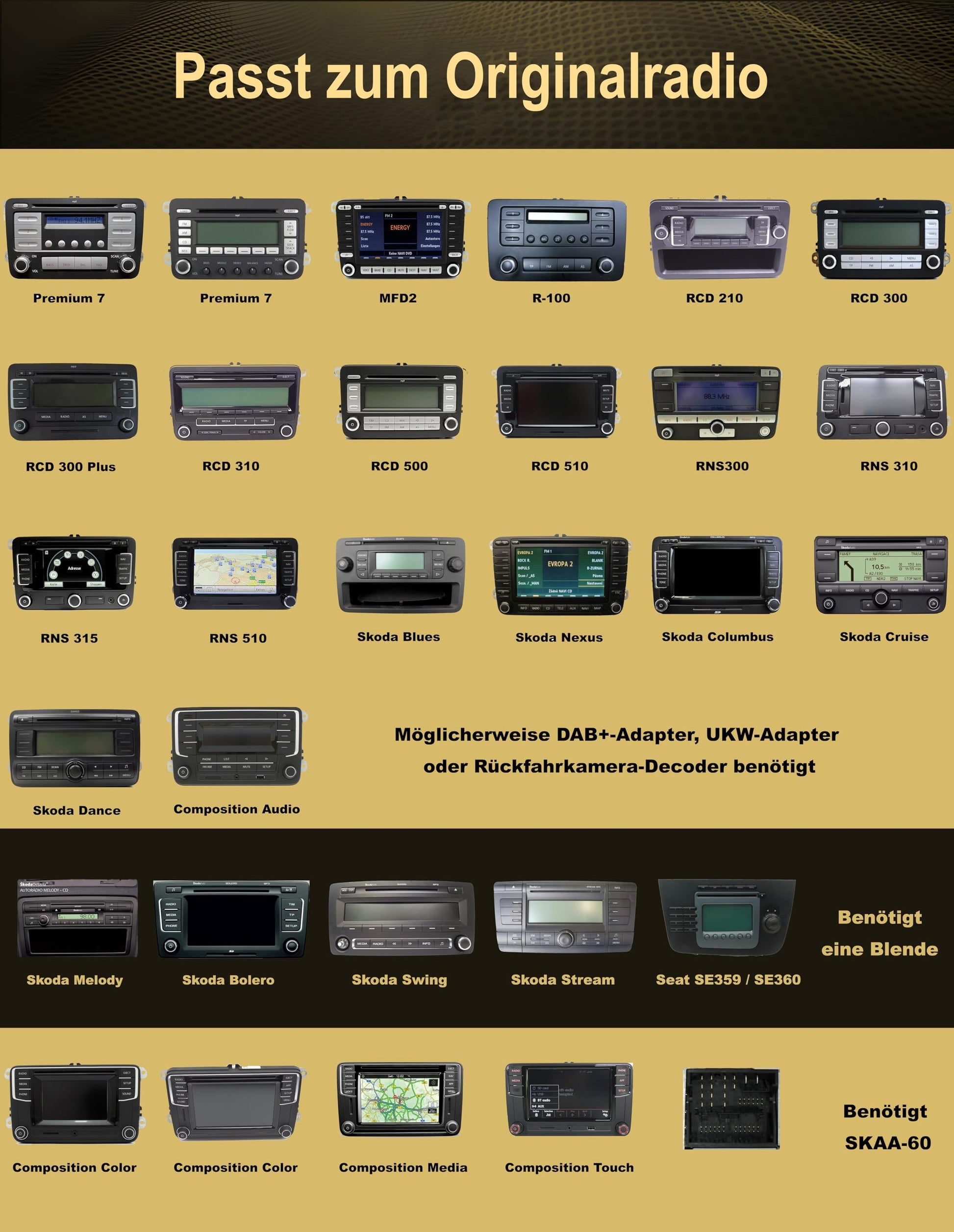 Das Radio ist für eine Vielzahl von VW-, Skoda- und Seat-Modellen konzipiert. Prüfen Sie bitte die detaillierte Fahrzeugliste. Der Einbau ist dank Plug-and-Play-Anschlüssen und CAN-Bus-Unterstützung vereinfacht. Beachten Sie jedoch, dass bei einigen Modellen ab ca. 2015 ein Quadlock-Adapter (QA) oder eine neue Blende benötigt wird.