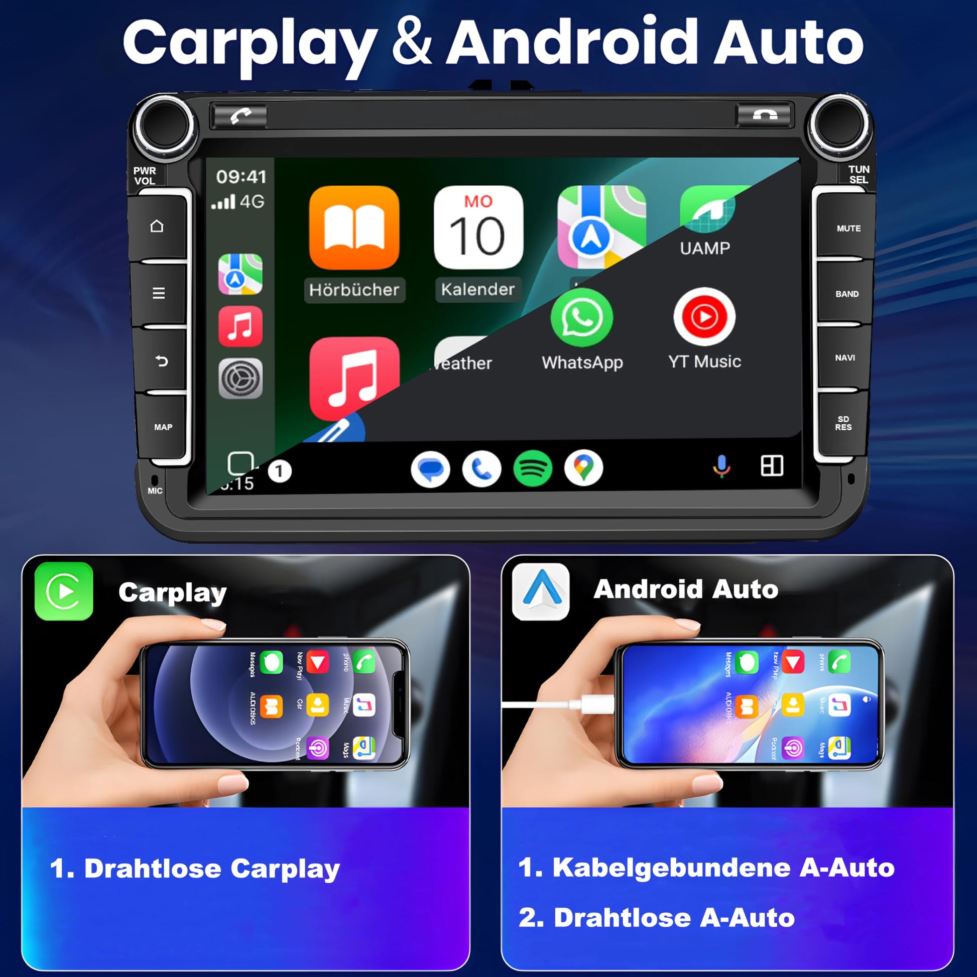 Ja, absolut. Das Gerät unterstützt sowohl kabelloses Apple CarPlay als auch kabelloses und kabelgebundenes Android Auto. So können Sie Apps wie Google Maps, Spotify oder WhatsApp direkt und ohne Kabelverbindung über den grossen 8-Zoll-Touchscreen bedienen.