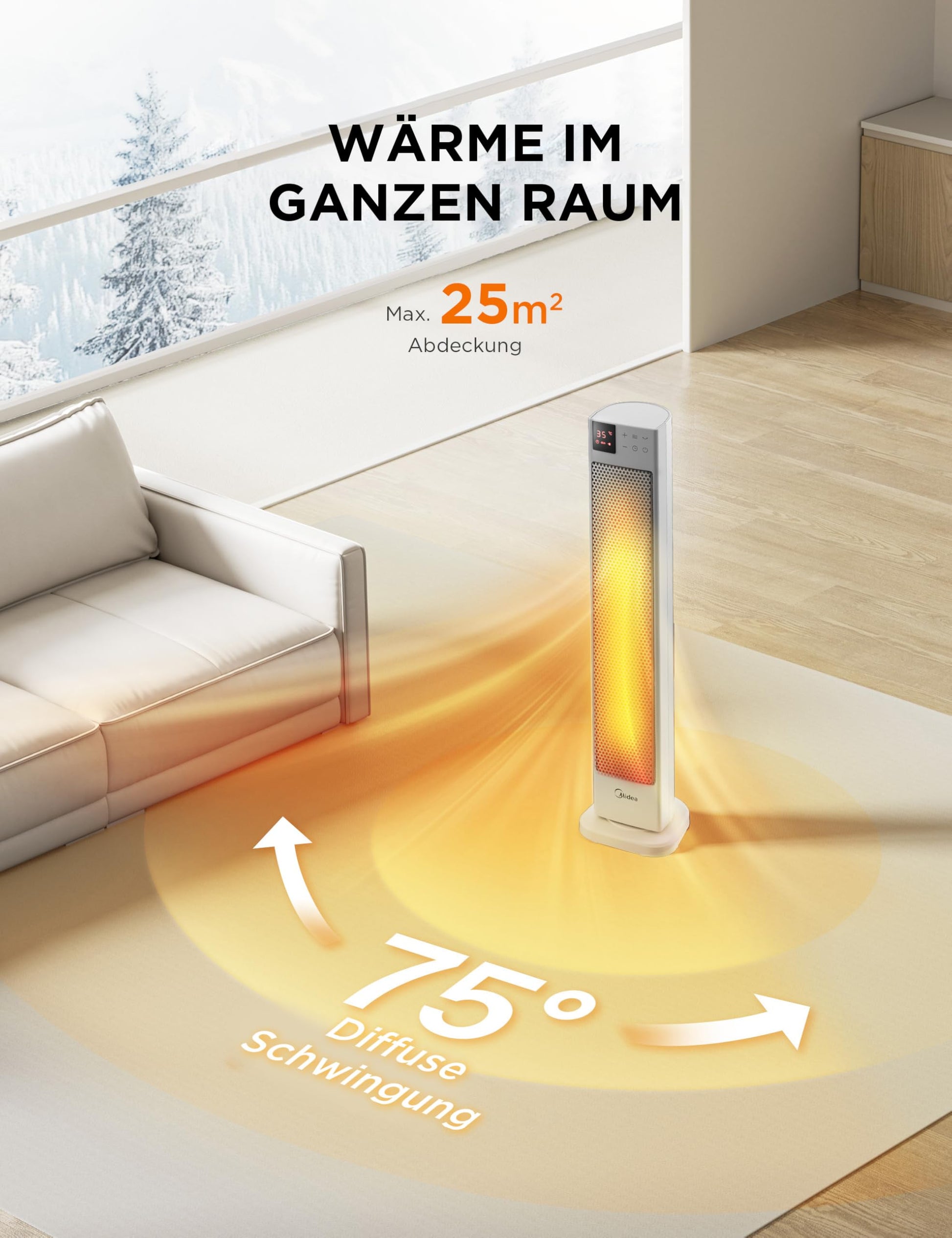 - Grosse Wärmeverteilung: Die 75-Grad-Oszillation (Schwingung) verteilt die Wärme grossflächig und eliminiert kalte Zonen im Raum.