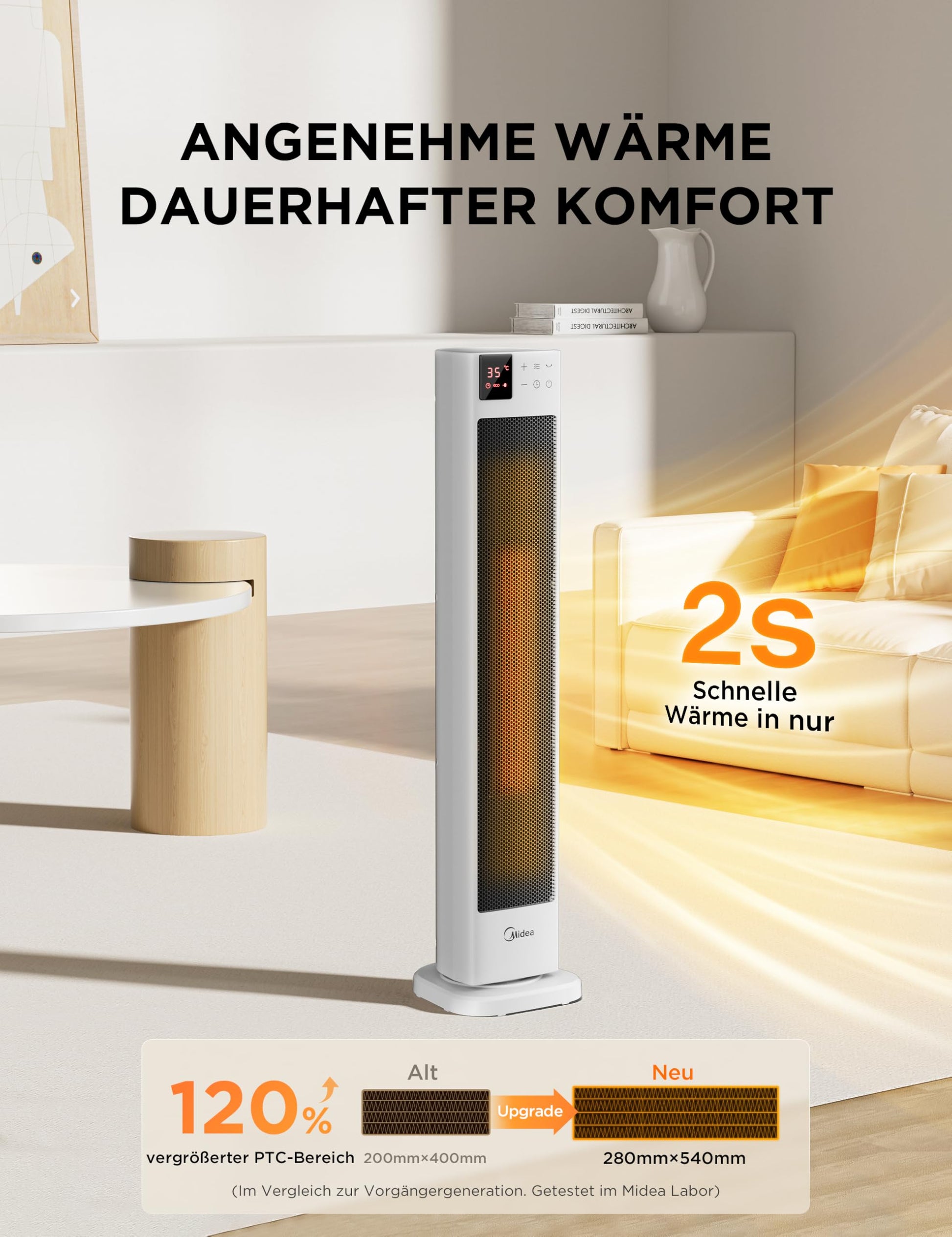Diese Heizung ist ideal für die schnelle Beheizung von einzelnen Räumen wie Büro, Schlafzimmer oder Wohnbereich. Dank des leistungsstarken PTC-Heizelements spüren Sie bereits nach 2 Sekunden eine deutliche Wärme, und die 75°-Oszillation sorgt für eine gleichmässige Wärmeverteilung.