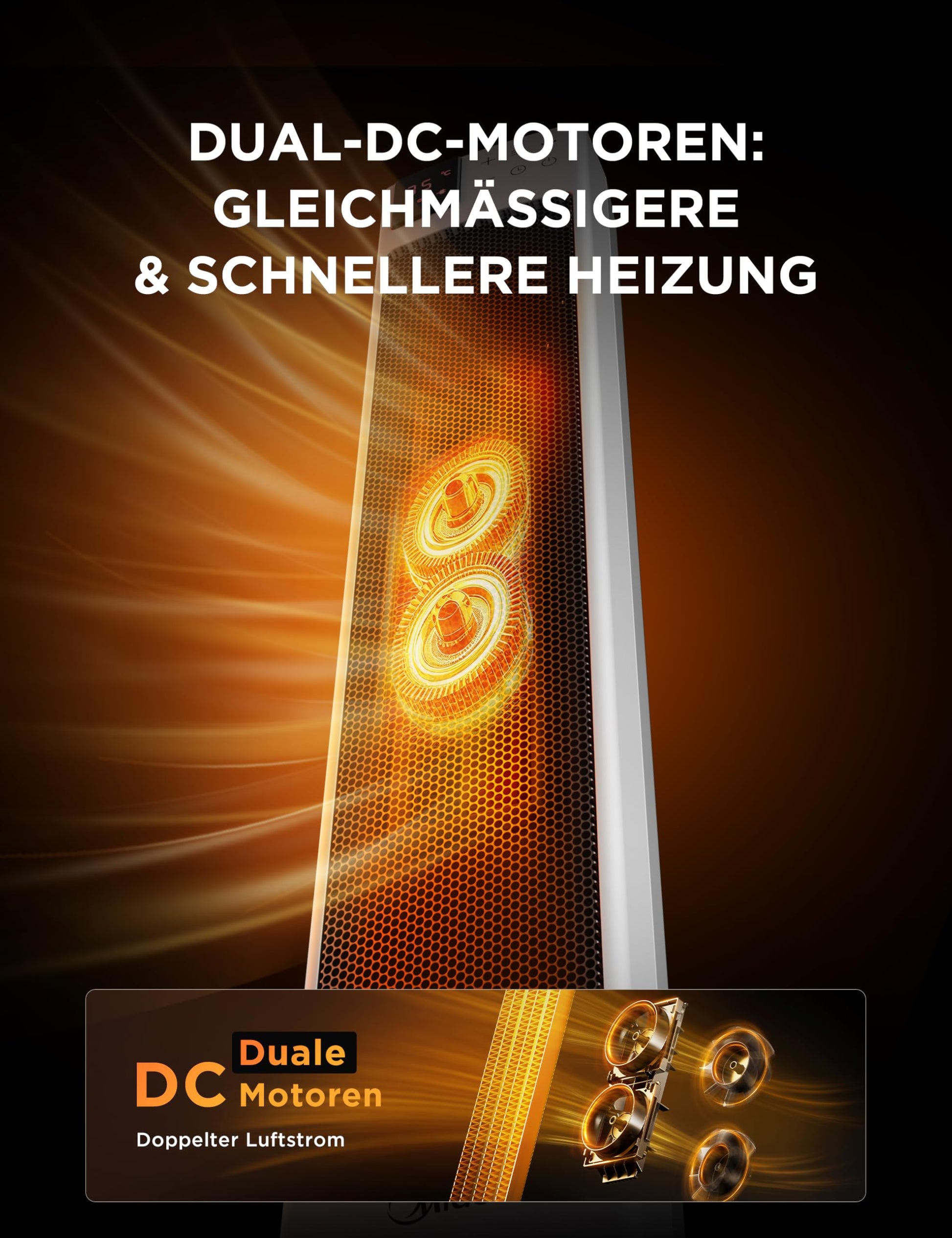 - Sofortige Heizleistung: Spürbare Wärme von bis zu 35°C in nur 2 Sekunden dank eines leistungsstarken Dual-DC-Motors und eines vergrösserten PTC-Heizelements.