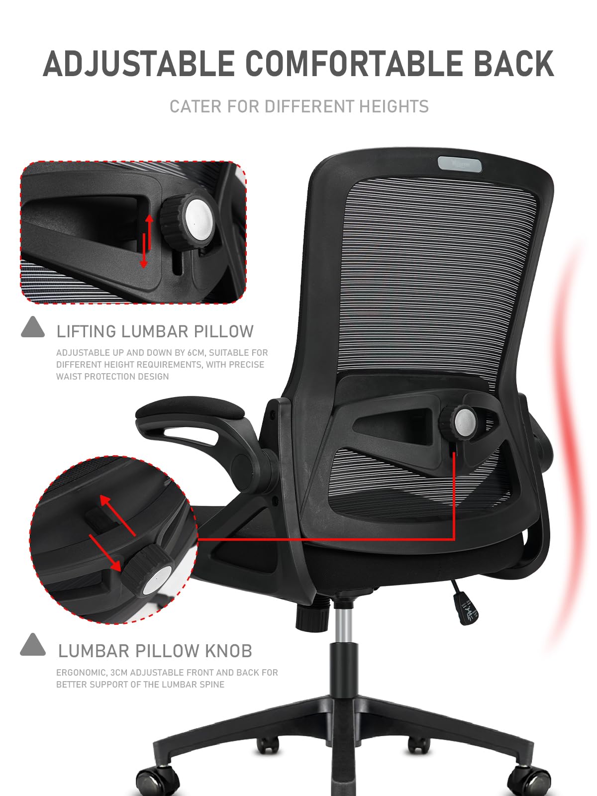 Fördern Sie Ihre Gesundheit: Die anpassungsfähige Lendenwirbelstütze und die ergonomische Form des Stuhls unterstützen eine korrekte Körperhaltung und helfen aktiv dabei, Rücken- und Wirbelsäulenschmerzen vorzubeugen. Das atmungsaktive Material der Rückenlehne sorgt dabei für eine angenehme Luftzirkulation.