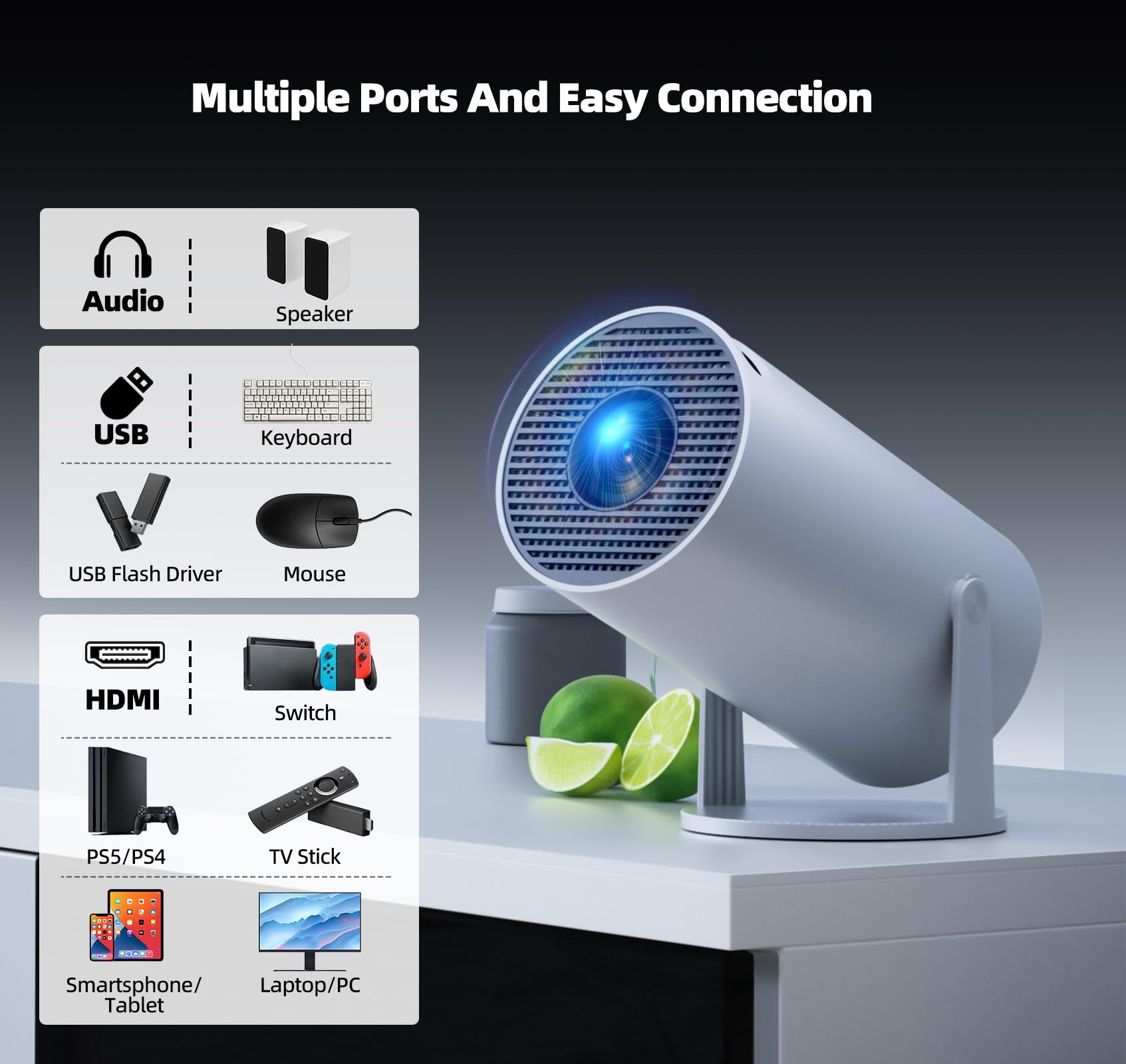 Passen Sie Ihr Klangerlebnis individuell an: Verbinden Sie den Beamer mit Ihrer bevorzugten Bluetooth-Box für kraftvollen Sound oder nutzen Sie Kopfhörer für ungestörten Genuss. Die Einrichtung ist ein Kinderspiel – die automatische Bildkorrektur und der einfache Fokus sorgen in Sekunden für ein perfektes Ergebnis. Dank des innovativen Schwenkfusses und des leichten Designs geniessen Sie ein Grossbilderlebnis von bis zu 130 Zoll, wo immer Sie es wünschen – ob im Wohnzimmer, Schlafzimmer oder im Freien.