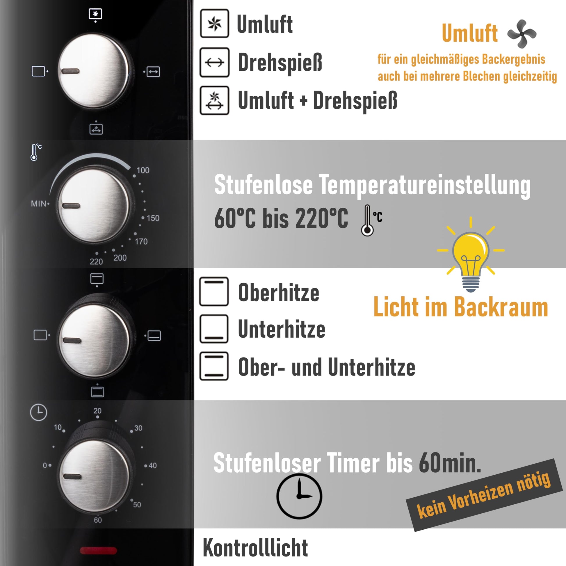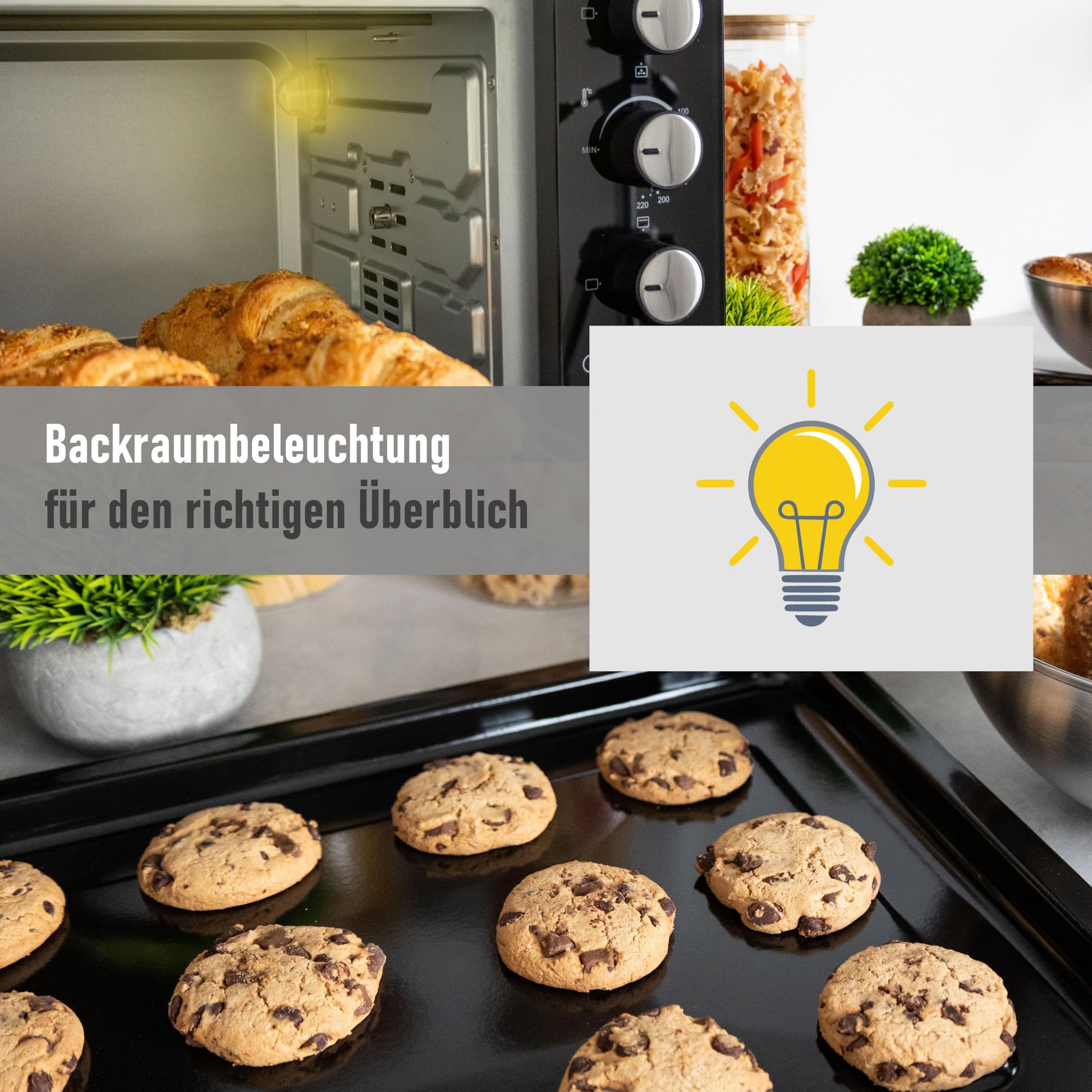 - Vielseitige Heizprogramme: Wählen Sie einfach zwischen Oberhitze, Unterhitze, kombinierter Ober- und Unterhitze sowie verschiedenen Umluft-Funktionen für perfekte Ergebnisse.