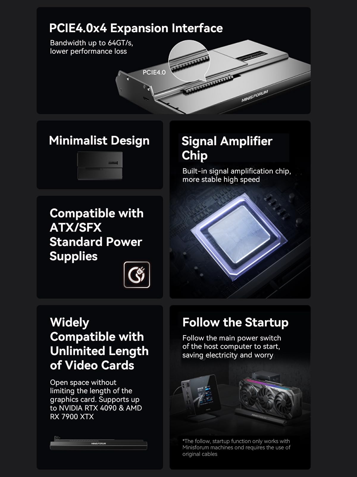 Das Dock ist grundsätzlich mit jedem Computer kompatibel, der über einen OCuLink-Anschluss verfügt. Es bietet einen Standard-PCIe-x16-Slot für die meisten Desktop-Grafikkarten. Beachten Sie jedoch, dass die automatische Start-Funktion ('Follow-Start') nur mit MINISFORUM Mini-PCs und den Originalkabeln garantiert wird.