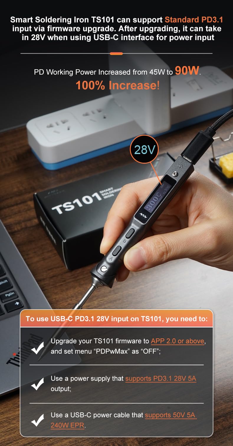 Die smarten Funktionen wie der automatische Schlafmodus schonen nicht nur die Lötspitze und sparen Energie, sondern erhöhen auch die Arbeitssicherheit. Die Möglichkeit, das Gerät vollständig an Ihre Bedürfnisse anzupassen, macht den TS101 zu einem persönlichen und hocheffizienten Werkzeug.