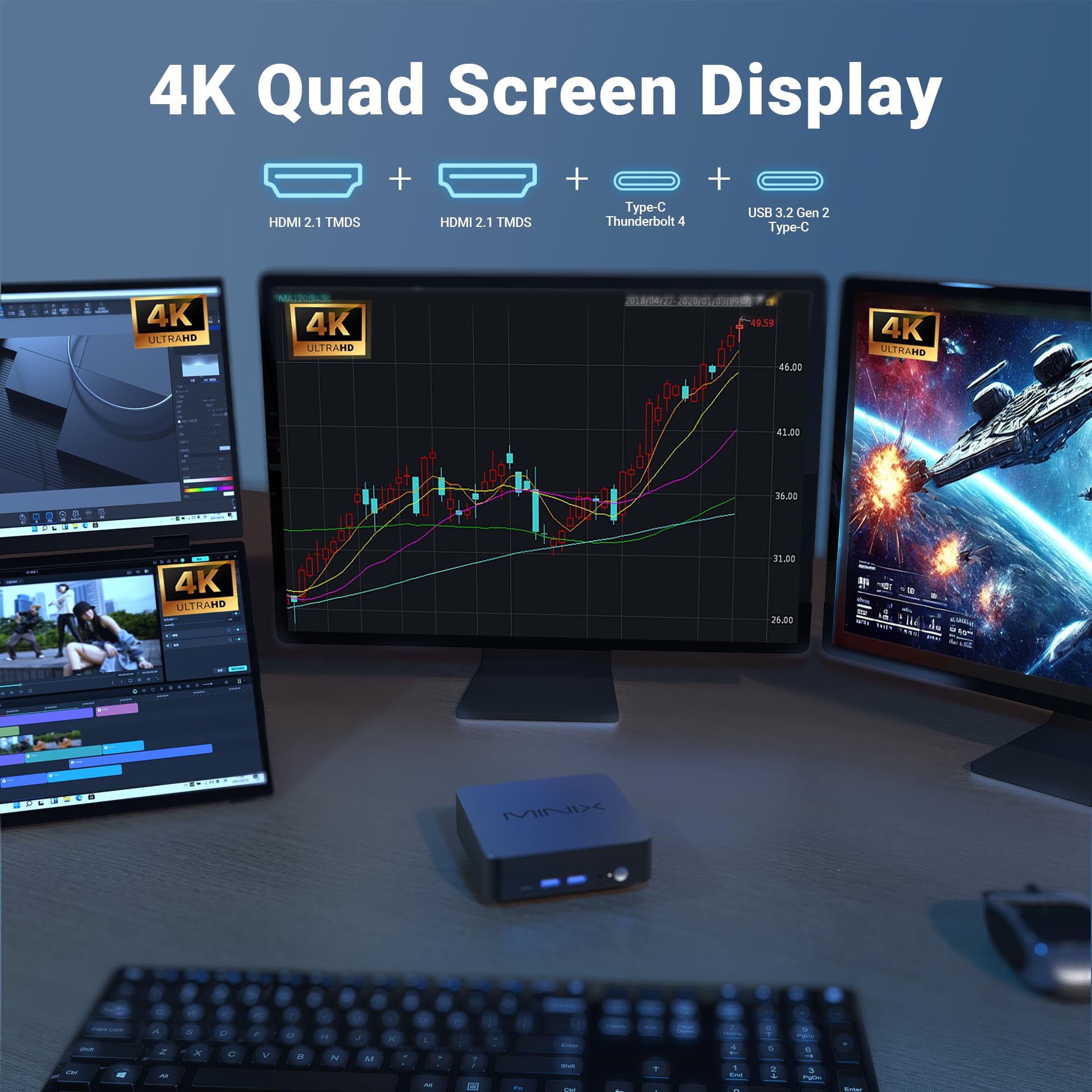 You can create an impressive multi-monitor workspace by connecting up to four displays simultaneously. The MINIX NGC N512 supports four 4K monitors via its two HDMI ports, one USB-C port, and a future-proof Thunderbolt 4 port. The Thunderbolt 4 connection also supports a single 8K display at 60Hz for ultra-high-resolution work.