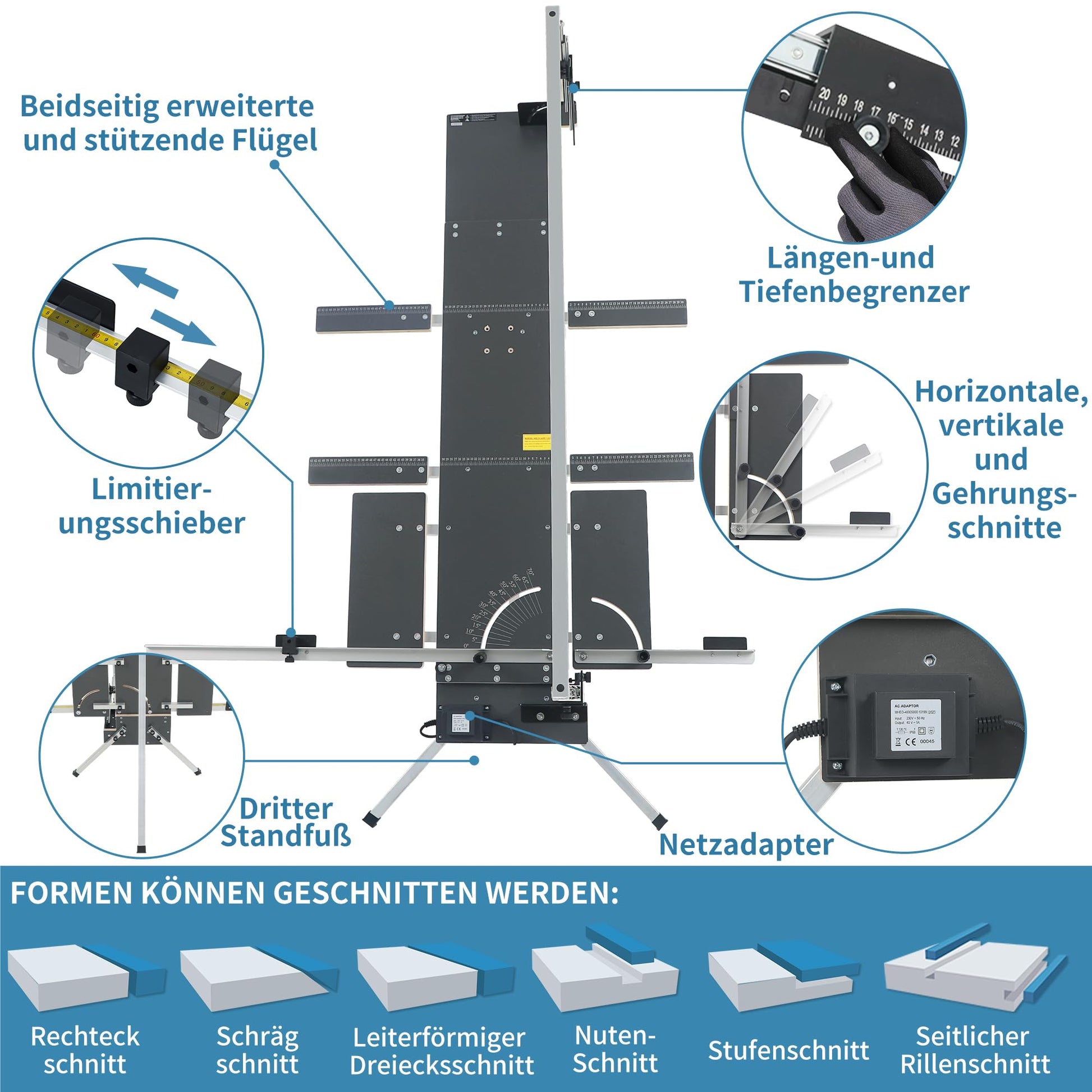 Sie können mühelos eine Vielzahl von Schnitten durchführen, darunter Gerad-, Schräg-, Gehrungs-, Stufen- und sogar Rundschnitte. Dank beidseitig von 0-90 Grad verstellbarer Plattenstützen, einer klaren Skala und einem justierbaren Anschlag erzielen Sie stets exakte und wiederholgenaue Zuschnitte.