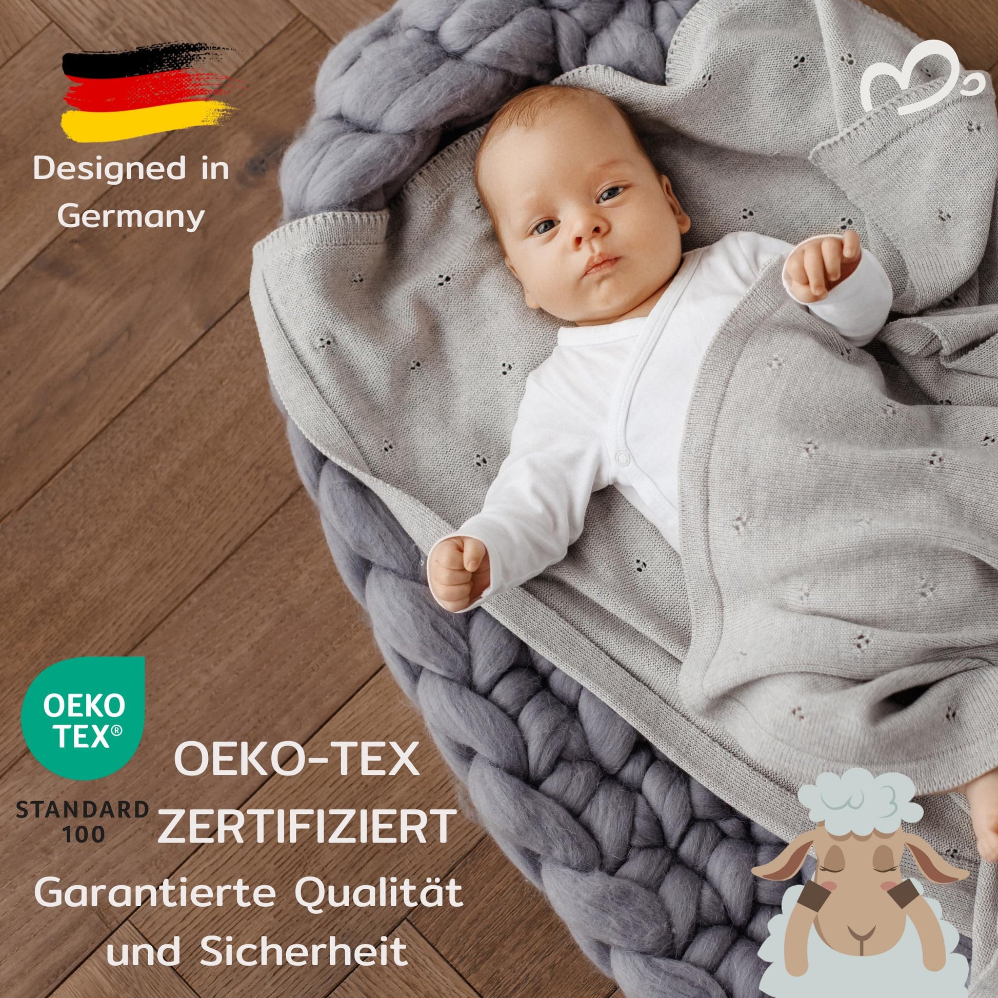 Ja, absolut. Die Decke ist aus 100 % reiner, weicher Merinowolle gefertigt, die besonders sanft zur empfindlichen Haut von Neugeborenen ist und höchsten Komfort bietet, ohne zu kratzen.